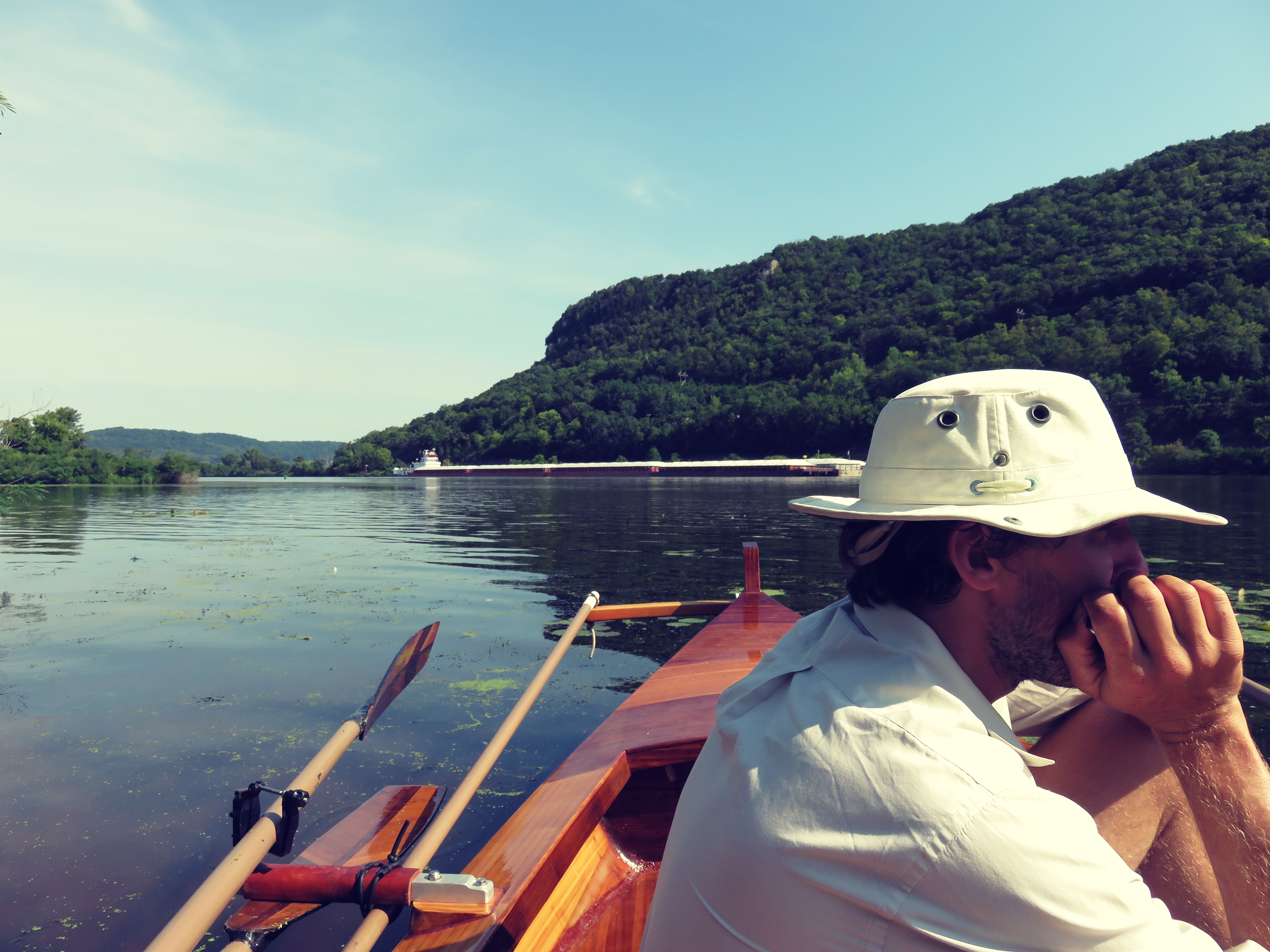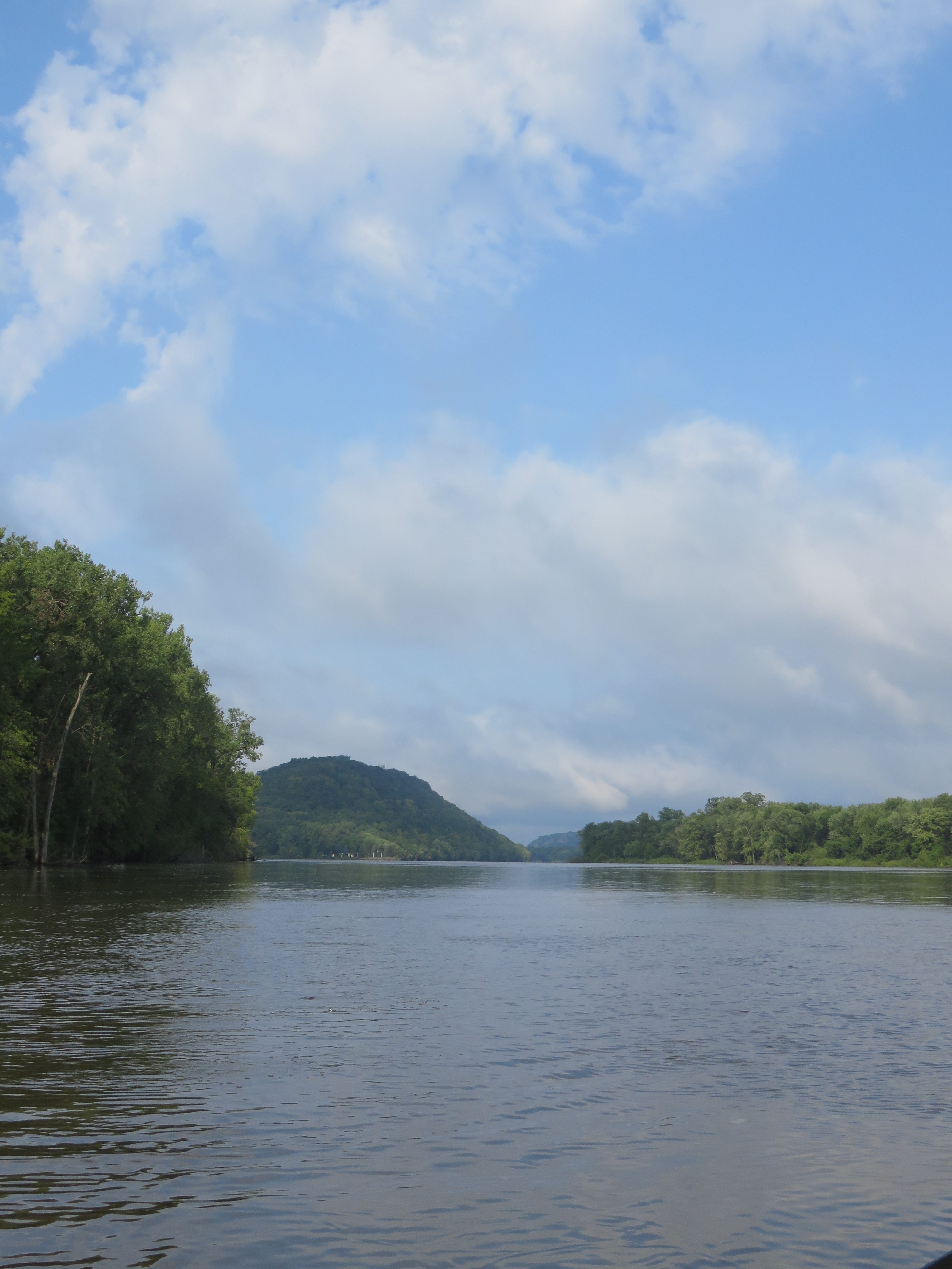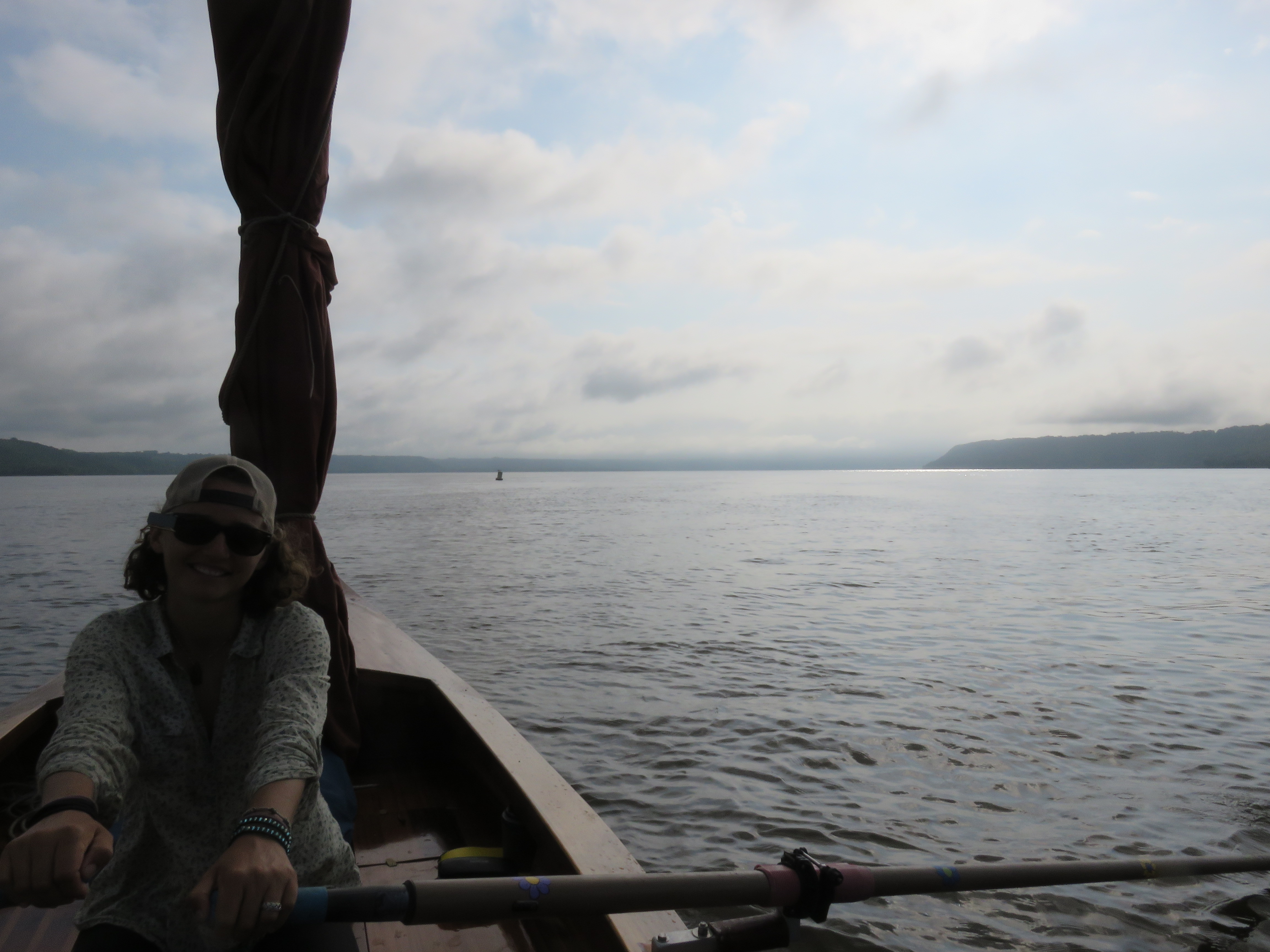 10am: Lake Pepin couldn’t be calmer and more serene for us. We left early this AM and only had to row about ten minutes before we set the sail. Since then we have been running with the wind at a consistent 4 knots. It is so incredible being in our little boat, sailing along with such perfect conditions. The contrast from the Lake Pepin we experienced 2 days ago makes me grin. I am sitting on my life jacket and seat cushion in the bilge while Kyle sits leaned against the stern behind me. He is on the tiller and because we are running the main sheet doesn’t need constant tending. All I hear is the rushing of water on Solvi’s blue hull- the sound changing a bit in the gusts- getting a little louder. Every once in a while I hear a train horn in the distance to my right.