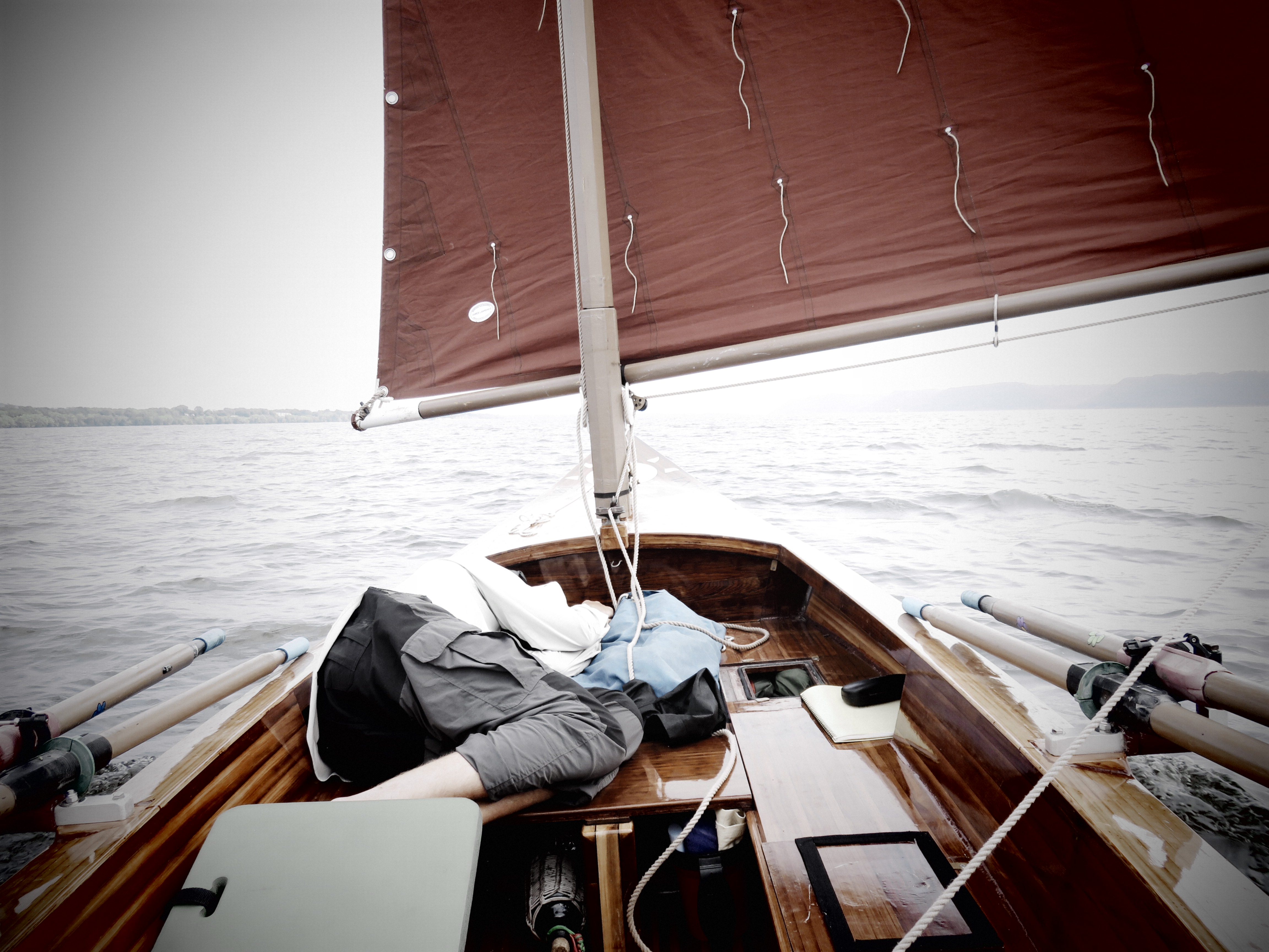 2pm: Clouds cover the sky in an array of gray hues. Different shades, shapes, and sizes, but it is light enough that the sun lets us know she is near by shall we need her. I am lying on the bench. I hear Kyle playing the harmonica while using the weight of his body to steer the boat. A sea gull flies above the boat while the harmonic sounds fill the air. Glorious.
