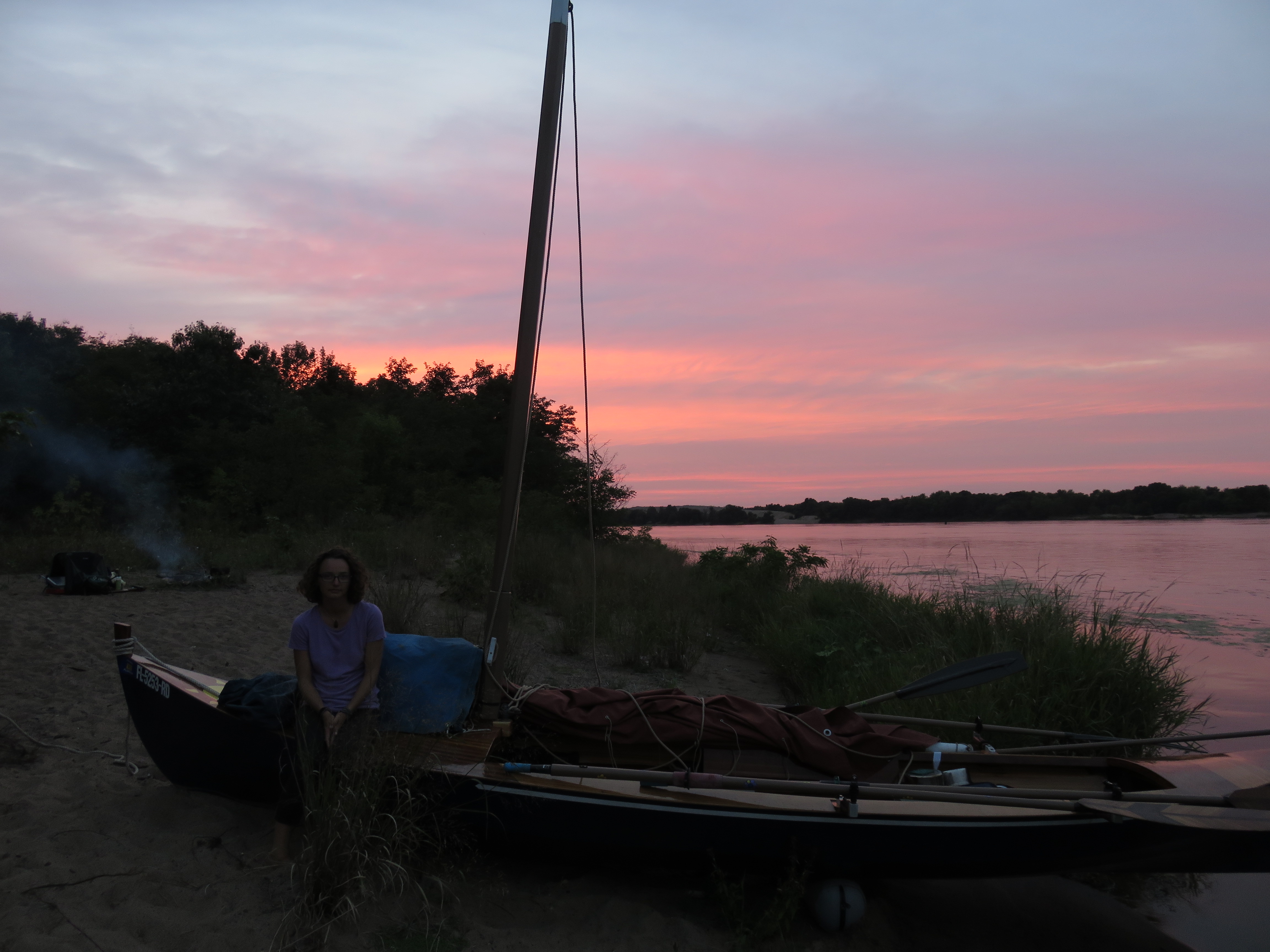 6pm: After finishing the crossing of Lake Pepin we were quickly welcomed back into the smaller riverway of the Mississippi by the current. It was awesome. The wind was still behind us, but now we had the current so we were making anywhere from 5-7 knots depending on the conditions. We completed 30 miles in six hours and only rowed a total of 10 minutes. It was amazing. We took turns napping on the benches and Kyle played his harmonica. As soon as we left the open waters of Lake Pepin the river changed. The water is clear- like we can see the sandy bottom- and yes, I said SAND! Not mud. All the islands are sandy. We could have kept going because the conditions were so good, but we saw the perfect sandy island with flowers, grass, trees, a fire pit, and we just had to stop. Within minutes everything was out of the boat and sprawled in every direction drying in the fabulous sunshiny breeze. We swam, played frisbee, made a fire, did yoga on our large beautiful cotton sheet. We looked for pebbles in the sand and walked the island. The change in environment was so extreme that we were giddy with excitement. Sunshine, sandy beaches, clear water, and the most amazing day of sailing. It really makes me appreciate the last 6 days of mud and rain because otherwise today wouldn’t have seemed so special. It won’t last forever and that’s okay- for now- in this moment we will soak in every ounce.