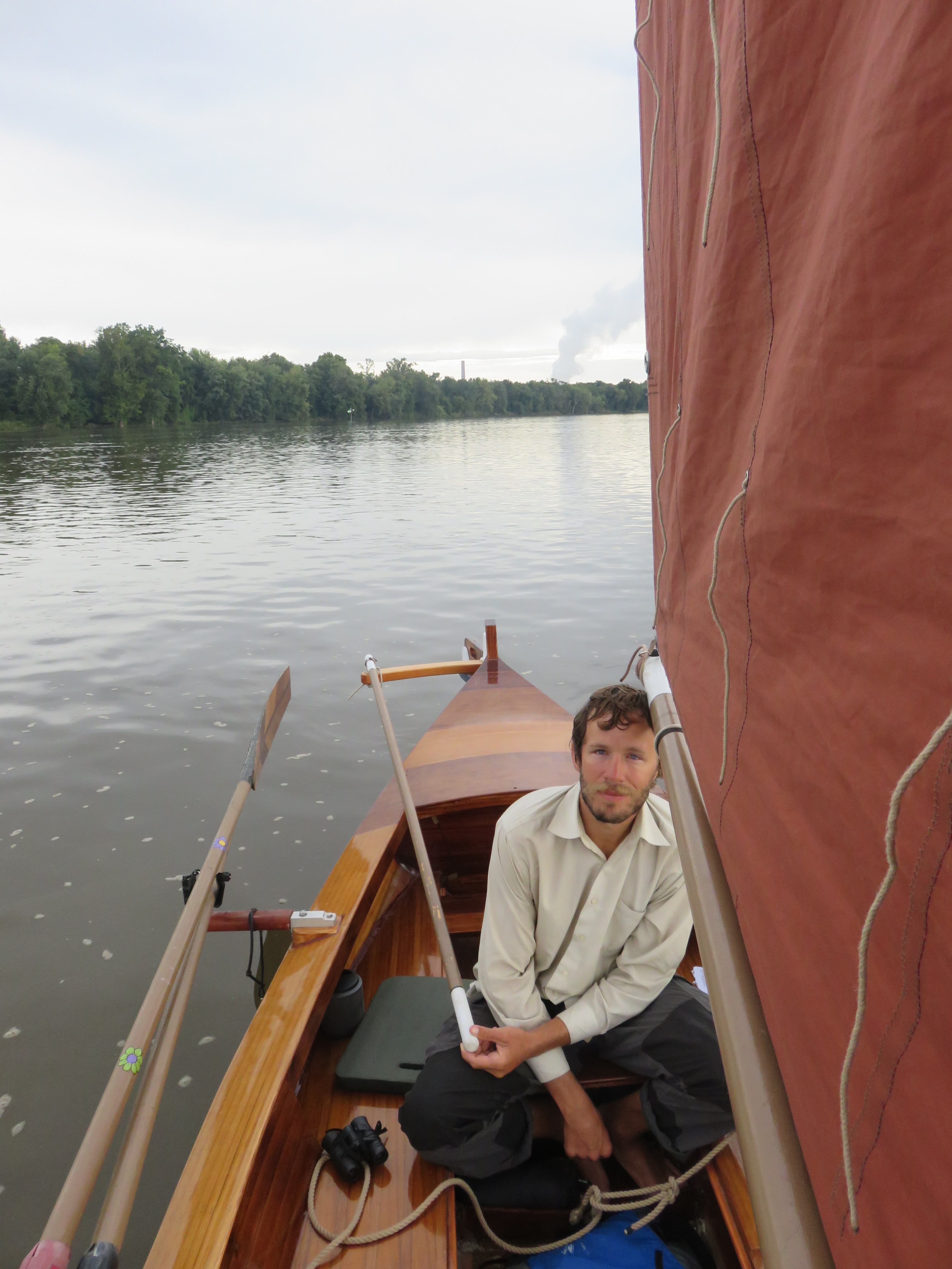 1:20pm: Kyle just relieved me from my hour shift on the sheet and tiller. I have our seats set up in a way that allows me to lay out flat in Solvi’s small interior. The clouds above me are so white and puffy, and the way the sun shines on them, they are glowing. There are so many scattered in what seems to be an even couple of layers. The sky behind the clouds is the purest of blues. Black birds fly in front of the white clouds and blue sky, causing their depth of color to be even more striking. What’s crazy is that the sky isn’t actually blue. That is just how we perceive it. I ponder this for a moment which leads me to contemplate the idea of perception vs. reality. I stare up, past the clouds, past the birds flying 20,000 feet above me where the air is thinner. And I know that beyond all that, the stars are shining, I just can’t seem them right now. It make me think of the Flaming Lips song, “Do you Realize?” We are in an 11 miles slough that runs parallel to the main channel. All the trees are full and the deep forest green color. We have sailed about 17 miles today and it’s only about 1:30. It’s been a special day, one full of light heartedness, laughter, sunshine, and a feeling of being free. We both seem to be thriving today. Life is good, I can see it and feel it all around.