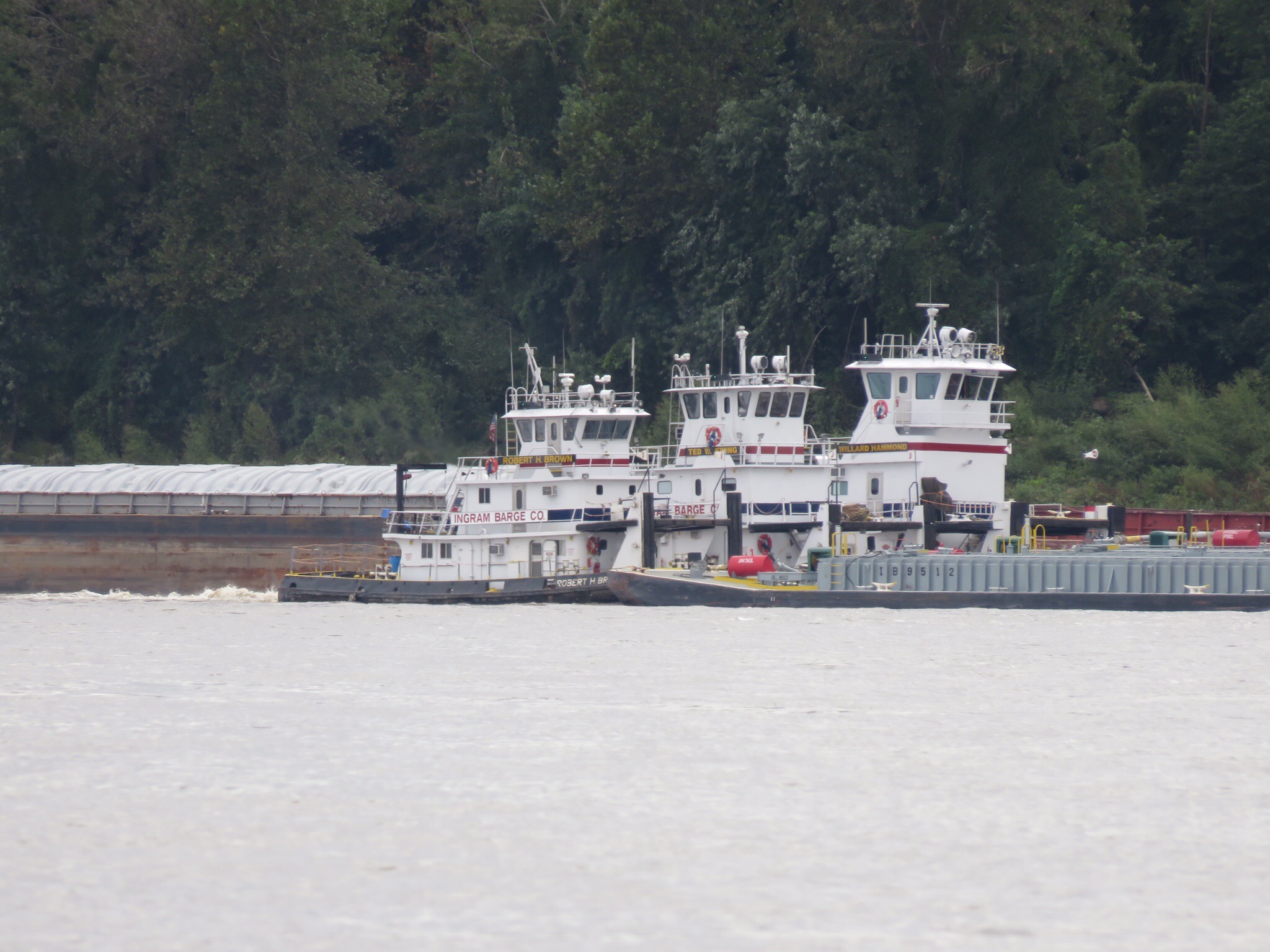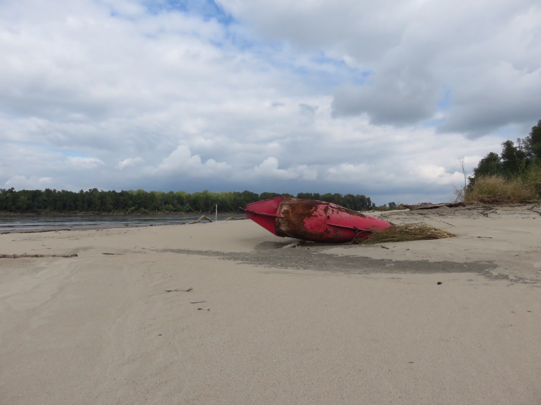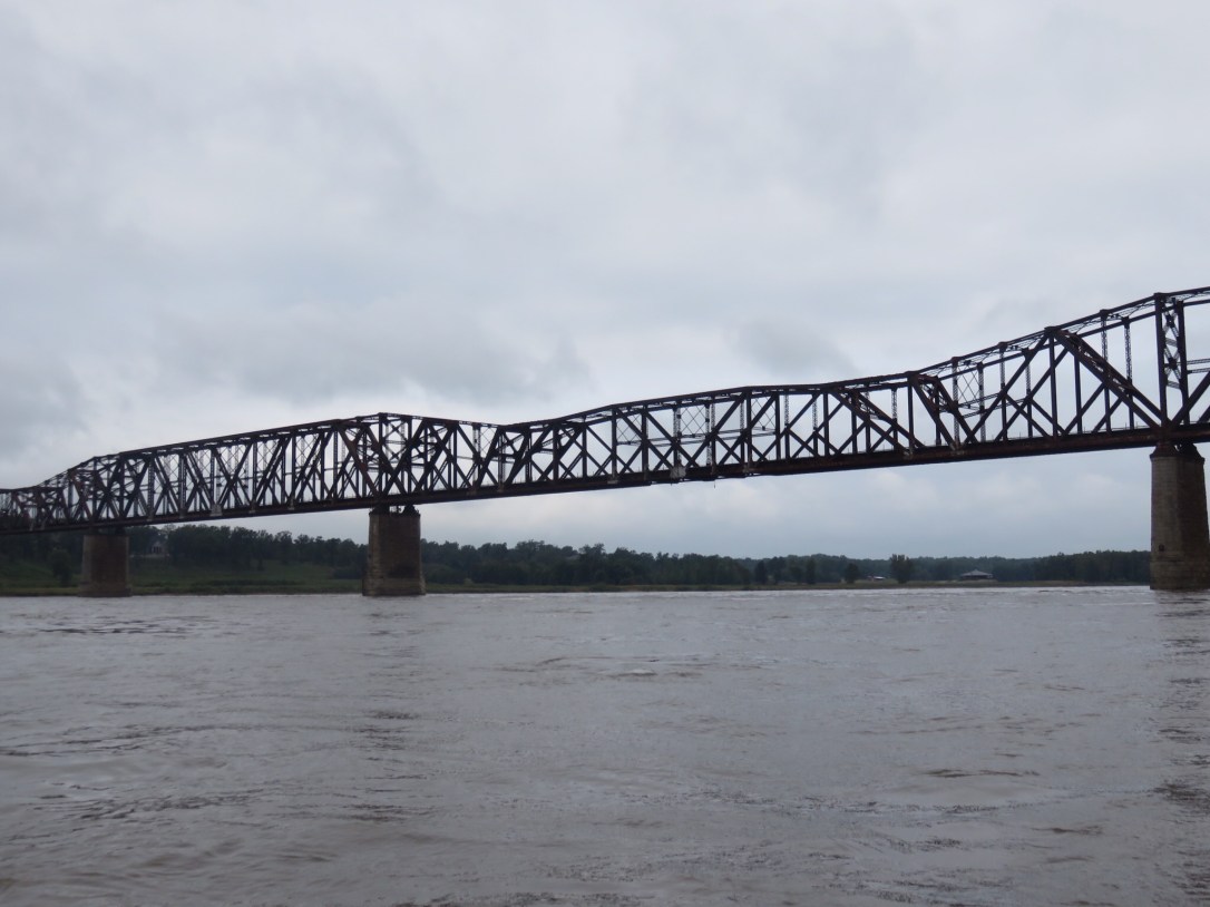 Cape Giradeau turned out to be quite the adventure. We arrived on Thursday morning around 11am. Using Google Maps and our chart book we found a small slough off the main river to hide the boat. From the main river we spotted the slough through the binoculars and headed towards it. As soon as we made the initial turn into the slough we were greeted by a pedestrian bridge. Being that it wasn’t on the channel there was no information about the height of this bridge; our mast is 15 feet tall and the bridge looked to be about that. Very carefully we approached the bridge, me standing on the foredeck looking up and Kyle ready on the oars to reverse us. I gave Kyle the OK to continue and he slowly glided us under the bridge that couldn’t be but 16.5 feet. Once on the other side of the bridge we found a shoreline with some trees that we could tie Solvi to. But when I went to step on the shoreline my foot immediately sank a couple inches…into mud. But this mud was like plaster and made it hard to pull my feet out. Being that we didn’t have anywhere else to put the boat and really were in a secure hidden spot, we decided to deal with the mud. Half way through the process of tying up Solvi and getting our backpacks we truly realized the uniqueness of the mud. It was so sticky, thick, and deep that the second anything came in contact with it, it quickly enveloped whatever it touched. Two days later I still can not get the mud all the way off my shoes. Anyway, after the ridiculously muddy task of securing Solvi to shore we climbed up the hill with our backpacks to head towards the grocery store. At the top of the hill, while shuffling our feet in the grass to attempt to remove the mud, we met Chuck who seemed to really like our boat and adventure. After chatting a while he offered to drive us the two miles to the grocery store so we would only have to walk one direction. We drove to the store in his work truck chatting all the while about our trip, the town, and the river. As we arrived at the grocery store I asked Kyle for his wallet so I could give Chuck one of our cards…Kyle didn’t have the wallet and neither did I, which means we couldn’t go shopping. Chuck overheard us and laughed and told us to get back in the truck. He then drove us back to the boat to retrieve the wallet before driving us back to the store. He was a really good sport; while Kyle went down to the mud to retrieve the wallet from the boat he said to me, “When he gets back ask him if he has the wallet.” We laughed and when Kyle came back up the hill, stomping his feet to get the paste off, I did as Chuck said and gave Kyle a hard time. Everyone got a kick out of it and we continued to the grocery store…again. What an extremely nice guy- Thank you Chuck, the wallet will not be forgotten again!