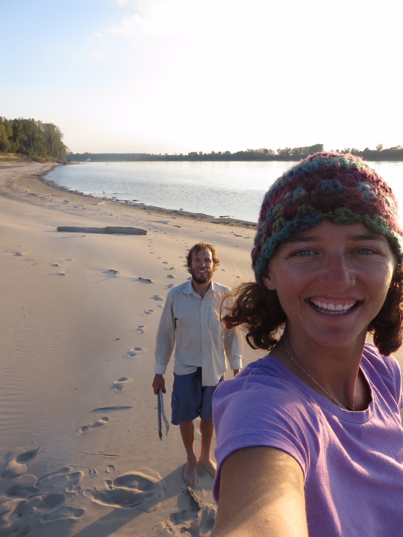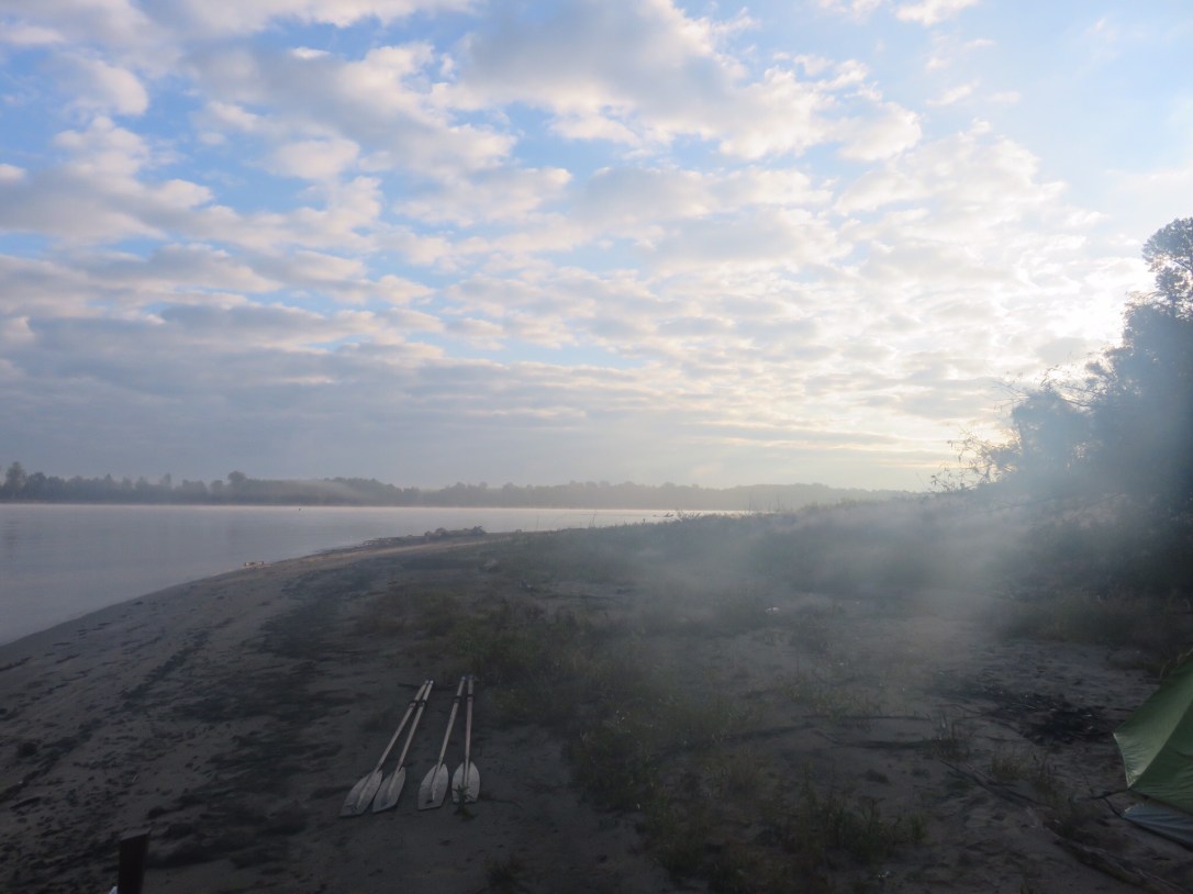 We awoke this morning again to gray skies. Since neither of us were feeling real motivated it was a slow morning. Coffee always helps though and after brewing two steaming cups over the fire we got underway. There was not a lot of wind so we rowed the 32 miles, but because the current is so fast there really is no need for us both to row. Alone, not trying very hard, I can comfortably row at 6.5 knots. Kyle can do the same, probably closer to 7. Therefore we took one hour shifts. This really helped to break up the day and not make it seem quite as arduous. Just after eating lunch we arrived at our first “horse shoe.” This is where the river does an 180 degree turn and you basically go the wrong direction for a little. At the same time, a north bound tug and barge were coming around the bend. Not wanting to deal with their wake or getting in their way, we pulled off on an awesome sandy beach for a while. We played frisbee, jumped and slid in the mud, and explored the island. When the river was clear we continued on the 8 miles to where we planned to camp.