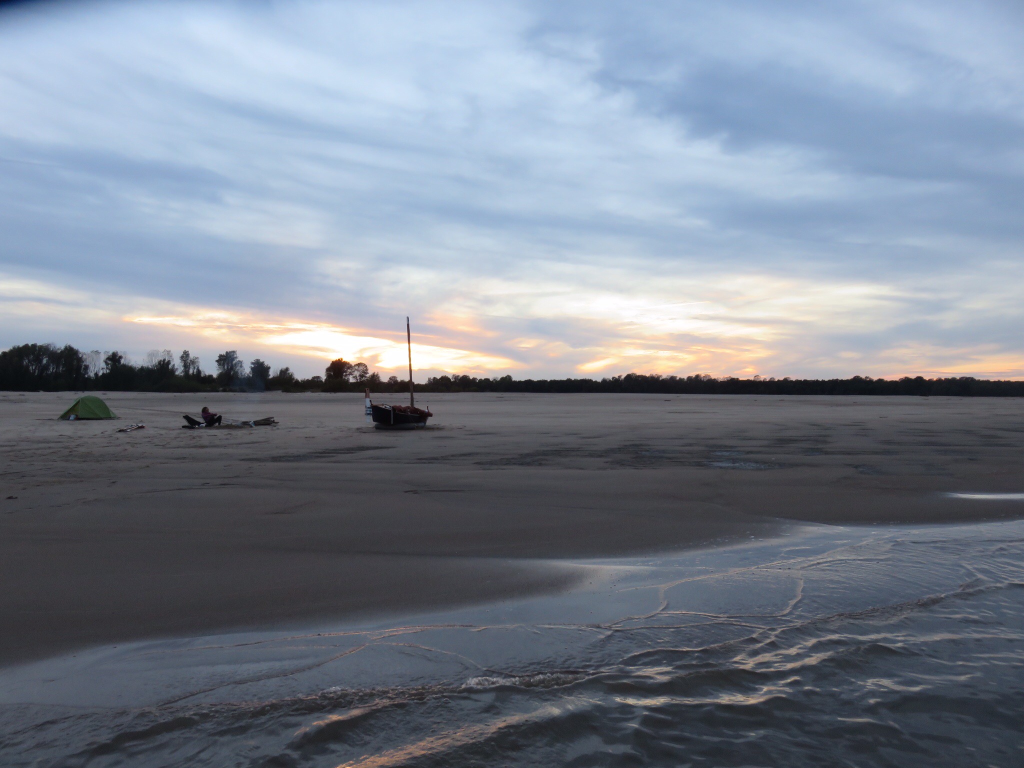 The rest of the day yesterday actually proved to be a bit trying. The wind was strong against us and because of that the rowing was extremely difficult. Therefore, we sailed, and most of the time it was fun and fast, but other times frustrating and hard. Because of our wing dam incident while sailing into the wind we have changed how we do things. When the daggerboard is down and we are sailing and see an oncoming tug and barge, we now drop the entire rig, pull up the daggerboard, row out of the channel, and wait until the push passes. Now we are able to drop the rig and start rowing within a 2 minute time frame- same for transitioning from rowing to sailing- but after doing it 5 times in a 3 hour time period, it begins to get a bit tedious. Add to the tediousness of pulling the sail up and down, there are choppy waves, high wind, and strong currents. Not only that, but it is also laborious. Raising the sail in a 15mph breeze is difficult for me, I find myself using all my strength to pull the sail up, but all the wind wants to do is blanket me with it, making it much harder to pull up because I can’t see and am being pushed by the full sail. It is hard on my hand, my arms, and my back. Kyle and I share the various tasks, but by the 5th or 6th time of dropping the rig, waiting for the push, and re-raising the rig, I was exhausted and annoyed. “I’m calling it!” I said frustratedly. At the beginning of this trip Kyle and I decided that if at any point either one of us needs to quit for the day, we will do so as soon as it is safe, all we have to do is call it out. Therefore after I called it yesterday and the tug and it’s 4 foot wake were gone, Kyle and I both laid back, me on the cooler and Kyle on the aft deck; we were beat. The wind, the sun, and the constant attention needed to navigate the day had worn us out. We had almost completed our 30 miles anyway so began to look for a place to camp. A massive sandbar was 2 miles down river, and we both sighed, neither of us wanting to move another inch, as we pulled on the oars for 20 more minutes. But as usual, once we arrived at our home for the night the frustrations and difficulties of the day faded away as we held hands and explored the beach, collecting firewood along the way. We ate a very large quantity of food as we sat by the burning fire and watched as the sun dropped behind the trees. It was a tough day, but it was good one as well! We must not forget that tough days can sometimes be the best of days 🙂