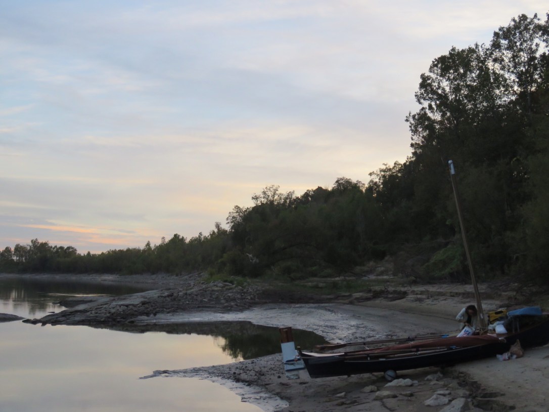 We sat down after chatting with the folks in the restaurant who informed us we had a new president, and ordered a big cup of water and two salads. While we plugged our various devices into the wall and pulled up wifi, Donny and his son Jacob came to sit by us to chat. We ended up having great conversation and before we knew it they had bought our lunch and offered to drive us to the grocery store and then back to the river. Speechless because of their kindness we filled our water jugs at the restaurant and piled in their truck on our way to Piggly Wiggly. Food, water, weather checked, and a ride- I was feeling much better about the day. We left the grocery store and headed back to the river. Kyle and I were expecting to get dropped off on the road before the levee leading to the river’s edge, but as they put the truck in 4 wheel drive and drove over the levee and got us as close as possible without endangering anyone, we giggled and said we were very surprised by the first class service! After taking some photos, saying our goodbyes, and making sure we had all our food and water, Kyle and I headed to the steep rock covered shoreline to avoid the poison ivy covered trail. We both fell at least once and it was quite the obstacle course but once we arrived at Solvi and saw the beautiful sunset reflecting on the river, we set down our loaded packs feeling satisfied. Then it hit me… “Kyle please tell me you have the phone and wallet…” As I watched him touch his hands to his empty pockets, my heart sank. The phone and wallet, together, were left in the truck. I was so concerned with making sure we had all our groceries and water jugs that instead of double checking the back seat, I double checked the truck bed before saying goodbye. We spent an hour searching frantically through our stuff, walking the obstacle course back to where they dropped us off. No luck. With no phone and no wallet and the sun setting there was nothing we could do until the morning. We talked about how to possibly get a hold of the nice folks who dropped us off. We knew their first names, their job titles, and the town, Lettsworth, they were from, but that was it.