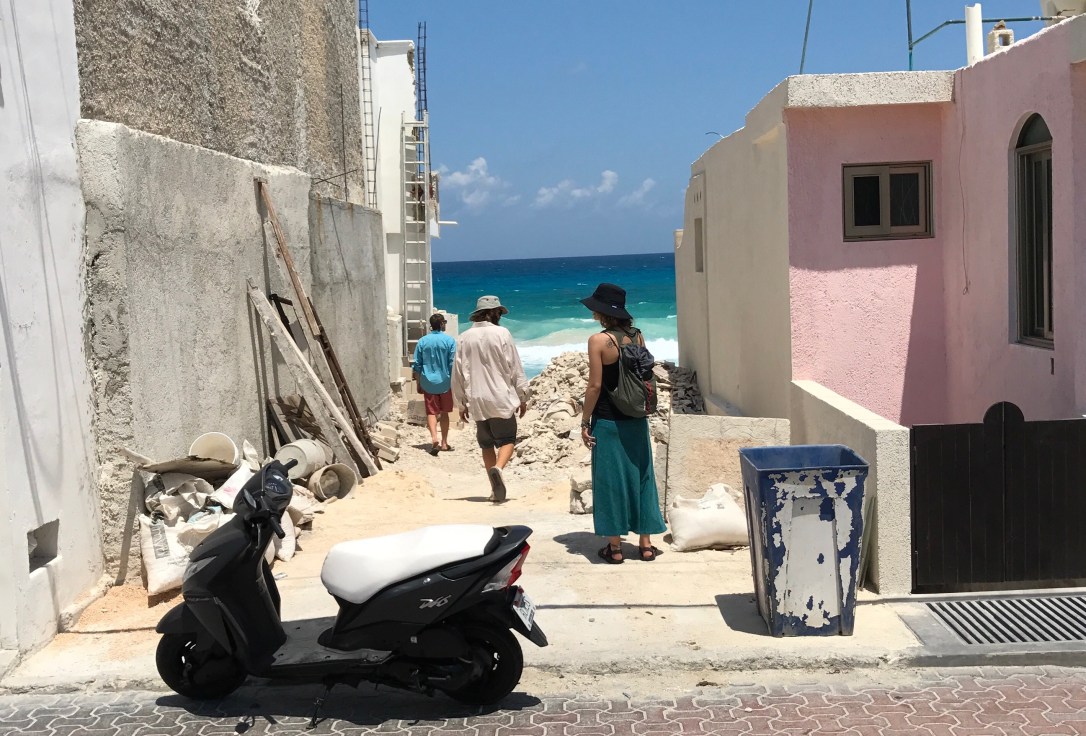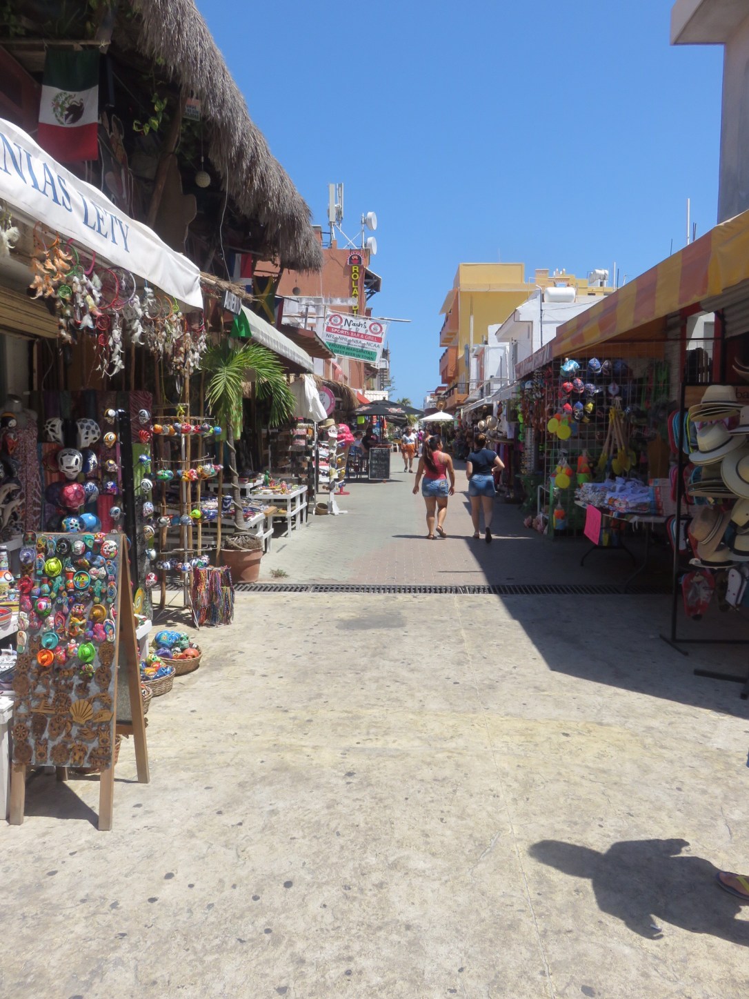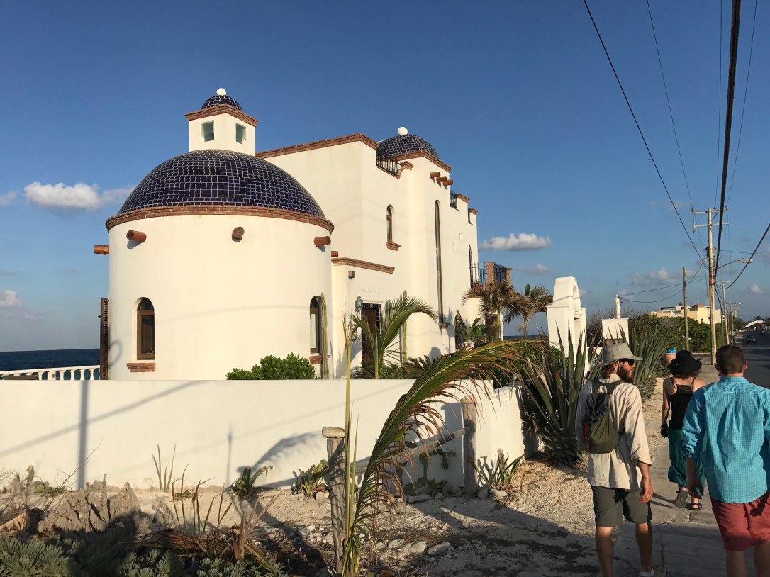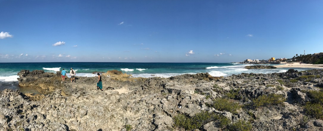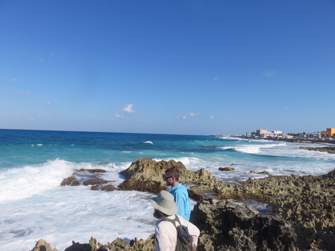 At the end of the process the immigration officer stamped our passports, provided us a visa, and welcomed us into the country. We all felt so thankful to be free to explore the country and not be confined to the boat. Within 20 minutes we had put on walking shoes and sunscreen, grabbed our backpacks and headed for the Island. Six hours and 8 miles later we had walked almost the entire Island! Leaving the marina we were instantly greeted by endless golf carts and mopeds; that is how everyone gets around on this island- even the police. The mopeds amazed me because many of them had over 3 people on them and then a baby or two hanging off the side in someone’s arms or standing at the driver’s feet- same as the golf carts. I will say though that everyone, except maybe the baby’s and small children, wore helmets on the mopeds. Interesting! Walking the Main Street for a while we quietly observed our surroundings- the colorful buildings and homes stacked really close together, the equally colorful skiffs lining the inland beaches, and some pretty awesome street art and murals. Finding a small opening between buildings we crossed over to the Gulf side of the island and walked North along the sea wall with large waves crashing down below. The waves were a mixture of clear blues and greens that would roll and smash down on the rock and white sand on the shoreline. Making our way back inland a bit we found the market area which were streets lined in colorful shops with jewelry, blankets, and endless trinkets lining the front of the small shops. Sitting down for some lunch I enjoyed the people watching and observing the cultural differences from America and this small tropical island. We found a convenience store and bought a SIM card for the Global cell phone we had bought before leaving and the nice men behind the counter helped me get it all set up- it took a few minutes due to the language barrier, but within 10 minutes Kyle and I were able to call our parents to check in and say hello. I was very thankful to be able to check in and catch up with my family! The rest of the afternoon was spent in a similar manner- exploring and enjoying the Isle of Mujeres. Around 6pm we arrived back at the marina where we took a quick swim to stretch our tired legs and sore bodies, before taking showers and using some wifi at the marina bar.