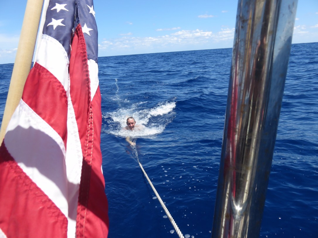 Anyway, skipping forward to Saturday and my goodness what a different and wonderful world!! I was starting to think I would never feel better and was absolutely dreading the rest of the passage- but Friday night I kept down some rice and by Saturday I was feeling good enough to make coffee and tea for the crew. The better feeling continued and right now, at 7pm on Sunday evening the boat is rolling through the waves and I am sitting and looking at the Ipad screen. Kyle and Max are reading, and Mark is on the helm, but can also read and write. Overall we have all adjusted 100% at this point and the moral is high! Yesterday afternoon the wind died a bit and we took the opportunity to swim behind the boat and rinse in fresh water. Kyle and Max climbed up the mast and jumped from the first spreader before grabbing the rope we had dragging behind the boat. Mark and I jumped from the side, but it was fun none the less being pulled behind High Climber’s stern in the deep blue water. Crazy to think the ground was 10,000 feet below us. Max made a big stew for dinner and we took turns on the helm throughout the night. I am not quite comfortable being on watch by myself at night yet, so Kyle and I have been tag teaming during the night hours. Generally speaking we do 3-5 hour shifts depending on how the person at the helm is feeling. It has been really nice because the people on off watch are getting anywhere from 6-12 hours of off time.