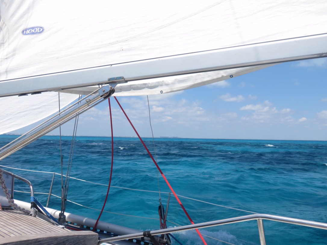 After an awesome morning of sailing downwind at a consistent 5 knots on Sunday we entered the Yucatán Channel where we were greeted by a rather strong current, really reducing our speed and progress towards Mujeres. We were only about 50 nautical miles away, but due to the current, a cross swell, and finicky wind the last 50 miles took us almost 24 hours to complete. It was a rather long and frustrating night with little sleep from any of the crew. Kyle and Max were up for hours throughout the night trying to change the sail plan and reduce the rolling of the boat. Whoever was on shift experienced the frustration of keeping the boat on course with the current and swell against us. Around 7am Monday morning towards the end of my 4 hour shift we made the decision to turn on the motor as we couldn’t seem to make much progress and were getting pushed North. Fortunately around 10am we left the current behind and the wind picked up from the East. With a strong wind we shut the engine down and Mark sailed us on a beam reach at a consistent 5 knots the last few hours; crew moral was instantly lifted with the pristine sailing conditions. At 11:00am Mark pointed to some structure off our starboard bow. Looking through the binoculars I saw trees on a Cay just North of Isla Mujeres’ location- “Land Ho!!!” Kyle bellowed. We all giggled and found ourselves giddy with the view of land for the first time in almost 4 days and within twenty minutes Isla Mujeres became visible directly in front of us. With perfect wind we sailed all the way into the Channel entrance of the island before dropping sail. The water below us changed from a deep clear blue to crystal clear water showing sea grass, white sand, and some small reefs.