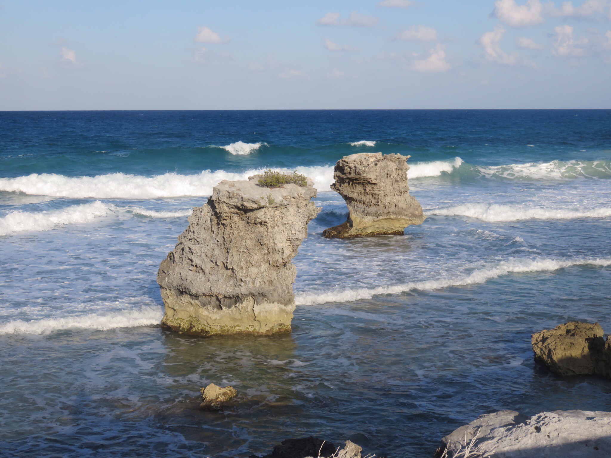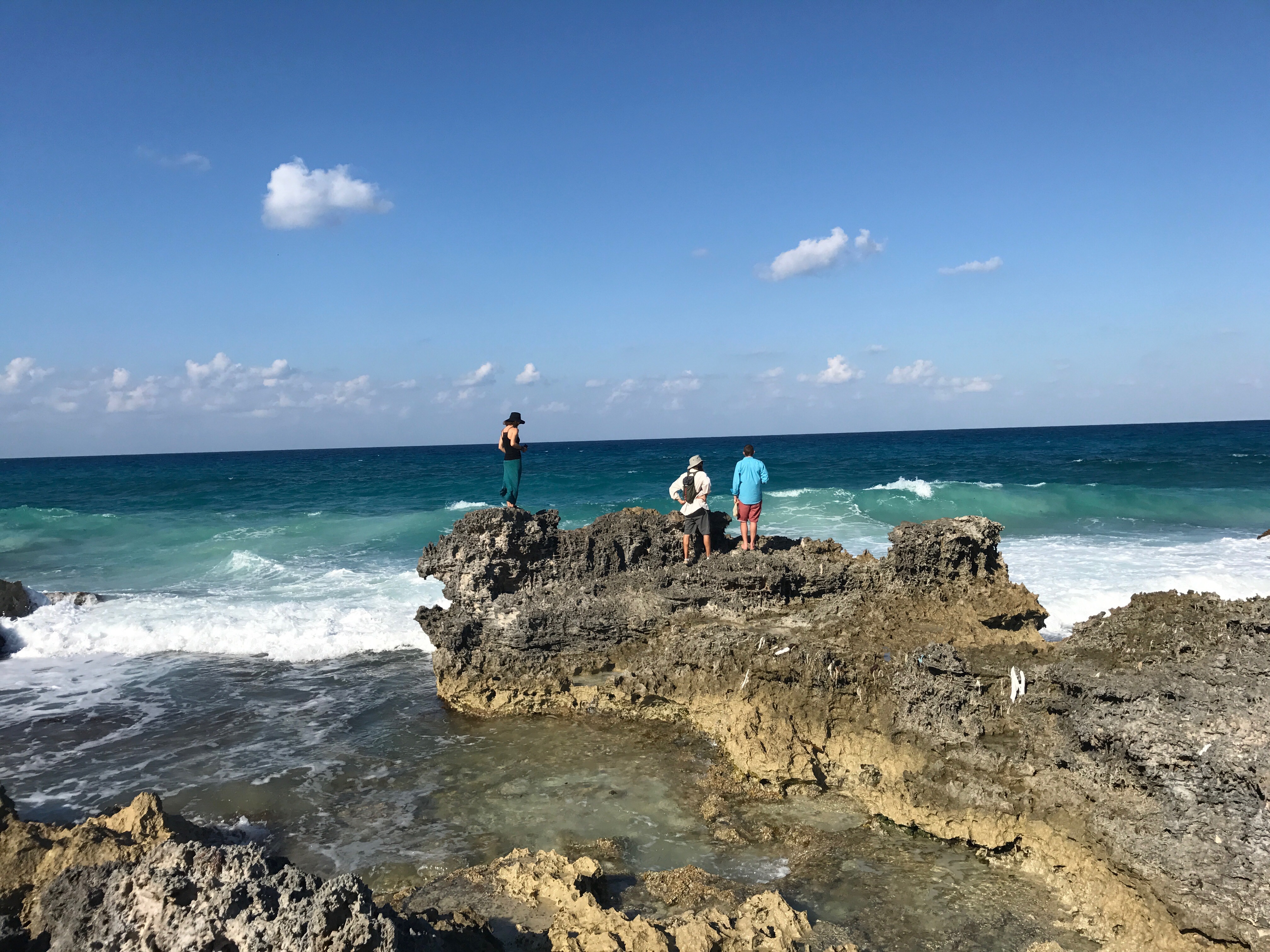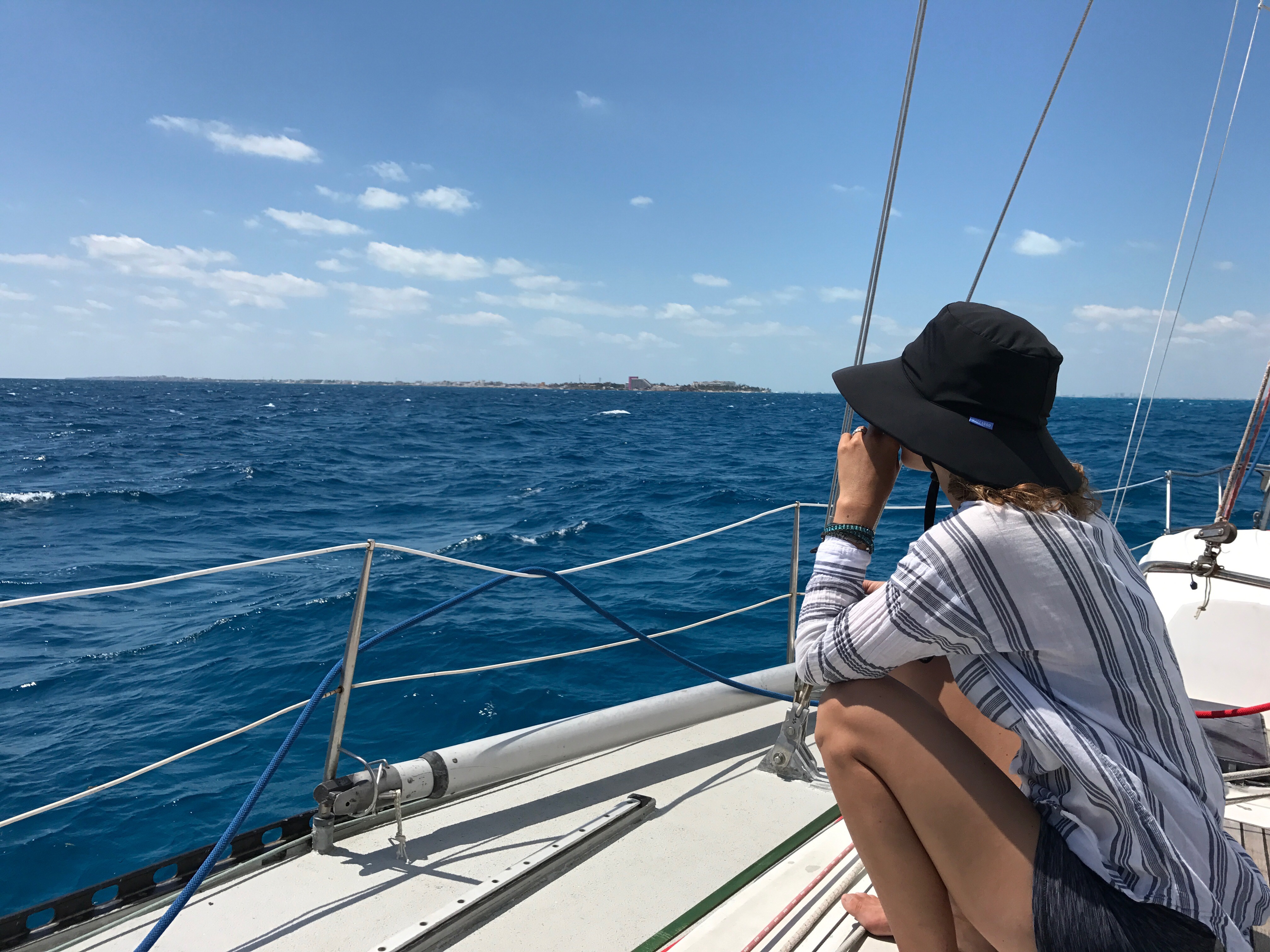 After an awesome morning of sailing downwind at a consistent 5 knots on Sunday we entered the Yucatán Channel where we were greeted by a rather strong current, really reducing our speed and progress towards Mujeres. We were only about 50 nautical miles away, but due to the current, a cross swell, and finicky wind the last 50 miles took us almost 24 hours to complete. It was a rather long and frustrating night with little sleep from any of the crew. Kyle and Max were up for hours throughout the night trying to change the sail plan and reduce the rolling of the boat. Whoever was on shift experienced the frustration of keeping the boat on course with the current and swell against us. Around 7am Monday morning towards the end of my 4 hour shift we made the decision to turn on the motor as we couldn’t seem to make much progress and were getting pushed North. Fortunately around 10am we left the current behind and the wind picked up from the East. With a strong wind we shut the engine down and Mark sailed us on a beam reach at a consistent 5 knots the last few hours; crew moral was instantly lifted with the pristine sailing conditions. At 11:00am Mark pointed to some structure off our starboard bow. Looking through the binoculars I saw trees on a Cay just North of Isla Mujeres’ location- “Land Ho!!!” Kyle bellowed. We all giggled and found ourselves giddy with the view of land for the first time in almost 4 days and within twenty minutes Isla Mujeres became visible directly in front of us. With perfect wind we sailed all the way into the Channel entrance of the island before dropping sail. The water below us changed from a deep clear blue to crystal clear water showing sea grass, white sand, and some small reefs.