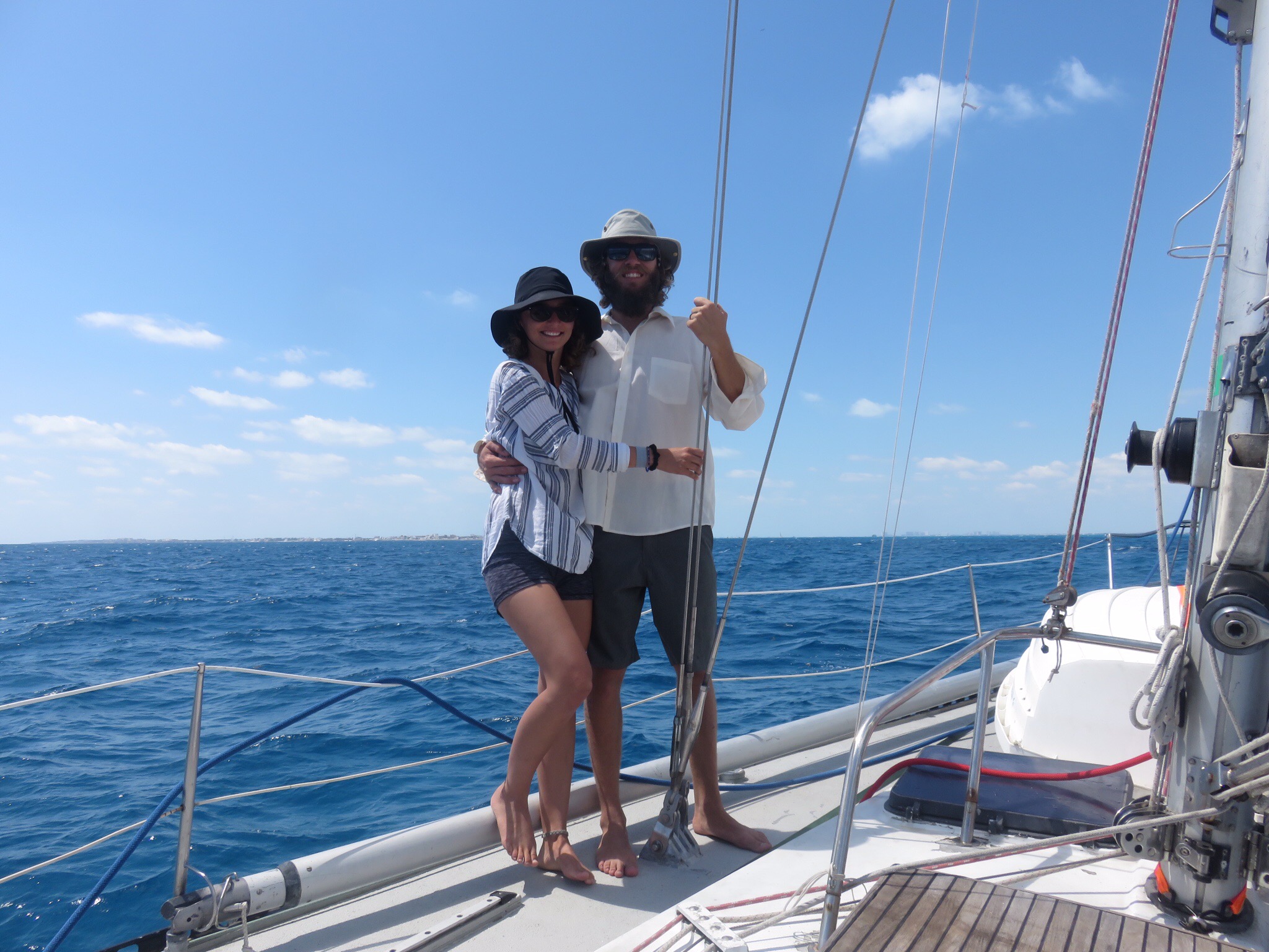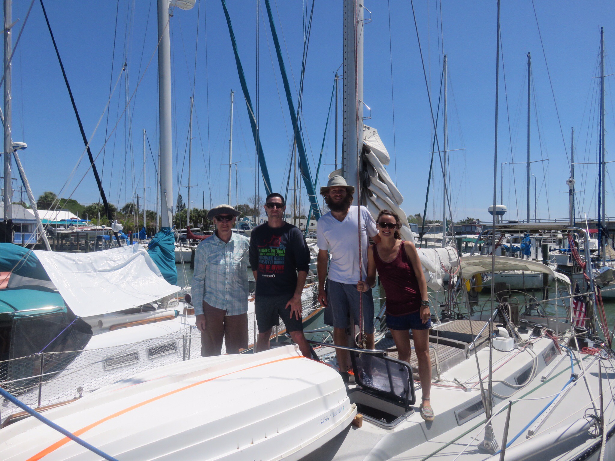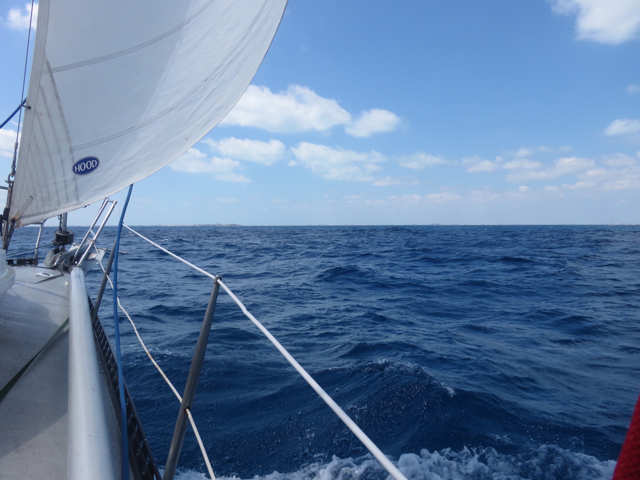 The first 24-36 hours of this passage were rather rough for me. We left on Thursday afternoon around 3pm with a wonderful farewell from our dockmaster at Blind Pass Marina and fellow dock friends. We then motored under a bascule bridge and then under the Pinellas Bayway. Our good friend Lynne rode her bike from Gulfport and was on top of the bridge when we went under- so much fun to see her 65ft up there- made my day to have her see us off! After filling up on fuel at Tierra Verda Marina we headed out towards the Pass-A-Grille channel to get out to the Gulf. Well, the wind had been blowing rather hard the few days leading up to our leave, and thus the waves leaving Pass-A-Grille were really big- about 8-9 feet. But those numbers really don’t give the waves or conditions justice. The waves were steep, compact, and standing- kind of like giant rapids as Max puts it. Not only that but we only had about 3ft of water under the keel, causing them to be more intense. Just 50ft away the waves were crashing hard on the sand bar. Needless to say it was an intense situation. To be honest, I curled up in a ball and cried, I was so scared. Max handled the situation at the helm wonderfully but suddenly the engine warning alarm began going off and we didn’t know why. There was nothing to do but hope the engine held out until we got through the channel. Kyle rubbed my back to keep me calm and Mark seemed to handle the situation well, although I was a bit distracted with my own fear. Anyway, after clearing the treacherous waves we were safe in deep water of the Gulf. I must give our captain Max credit for getting us through safely and calmly. The engine turned out to be okay and we turned it off and raised sail; I always forget how loud engines are until they are turned off. Once out in the Gulf the waves were still much bigger than I was anticipating and it began to make the crew sick. Mark and Kyle became sick rather quickly, while I laid in the cockpit and slept, Max stayed on the helm. The next 20 hours are blurry for me and I can’t particularly remember the series of events. I never really got sick, but just generally felt awful. I know that I didn’t go down below for a full 24hrs and just camped in the cockpit. Mark, Kyle, and I took bonine which provided some relief but not a lot at first. In reality the conditions weren’t that bad by Friday morning, but my body was having a hard time adjusting to the non-stop moving. By Friday evening Mark and Kyle were on the up and up and were able to keep down some food, water, and take full shifts.