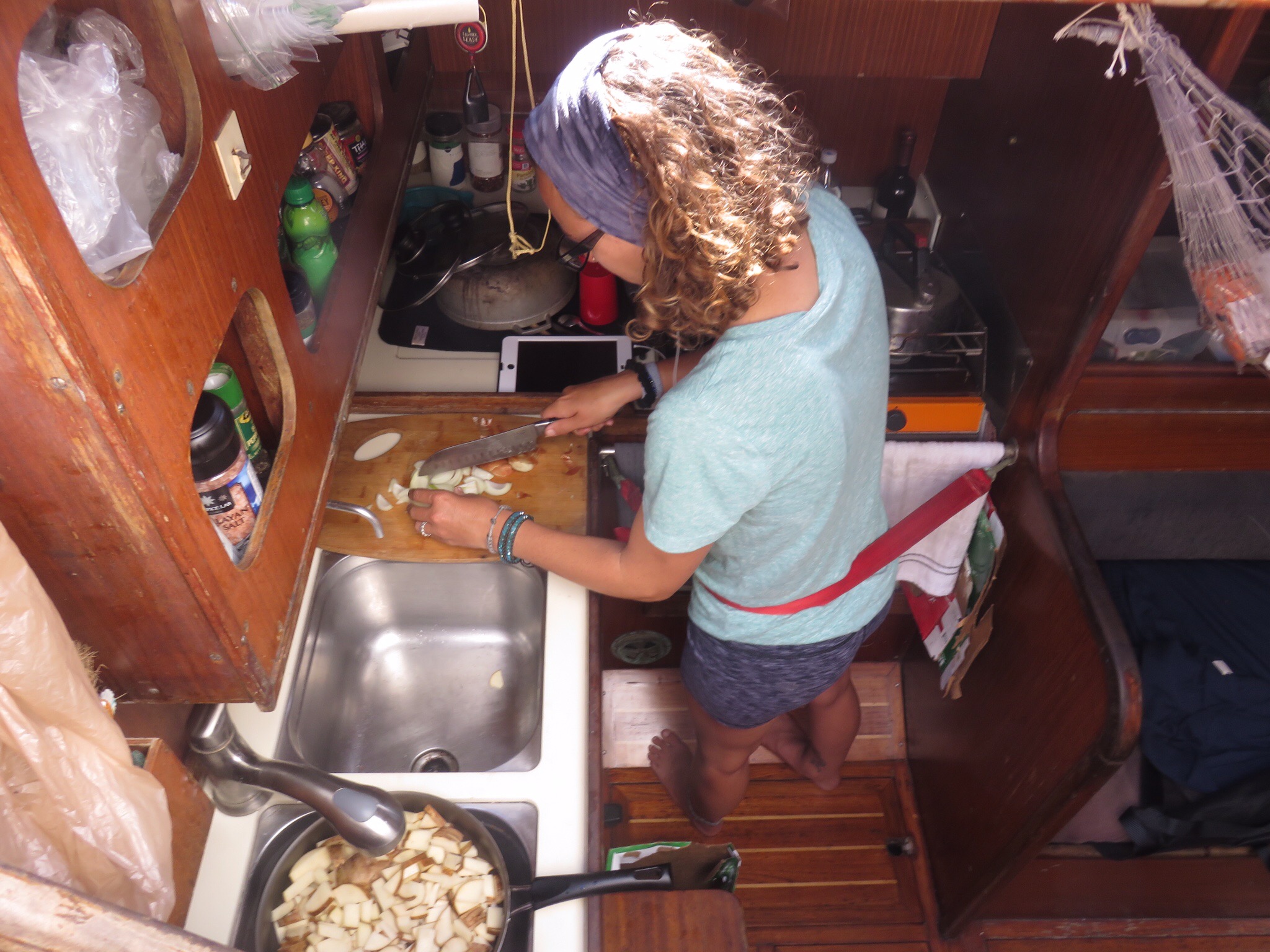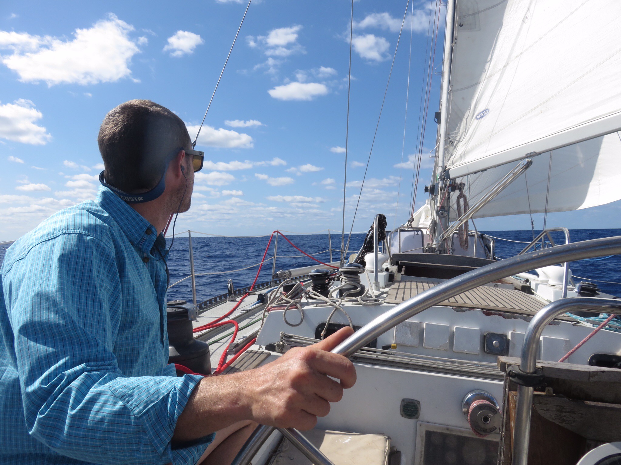 This morning I woke up and made breakfast burritos with potatoes, eggs, onions, and tortillas. I was able to use the nylon strap connected to the stove to hold me in place while I cooked which was very helpful. I have never used one before but I feel as though I would not have been able to make such a successful meal without the strap. The boat is constantly rolling and thanks to the gimbaled stove and tie in cooking has been quite enjoyable. I then took watch for about 4 hours and had the most enjoyable shift! The wind has been blowing from behind us about 95% of the time which is causing a following sea. So to any of you whom wished us fair winds and following seas- THANK YOU! That is exactly what we have had and it has been quite magnificent. Holding the large wheel and steering the boat down wind through the rolling seas and ever so often surging down a wave gives me a feeling few things else in this world do. It’s so powerful being pushed by the wind in your house with all your friends and belongings with you. Sometimes I would listen to music, other times I just listened to the water flow along the hull of the boat.