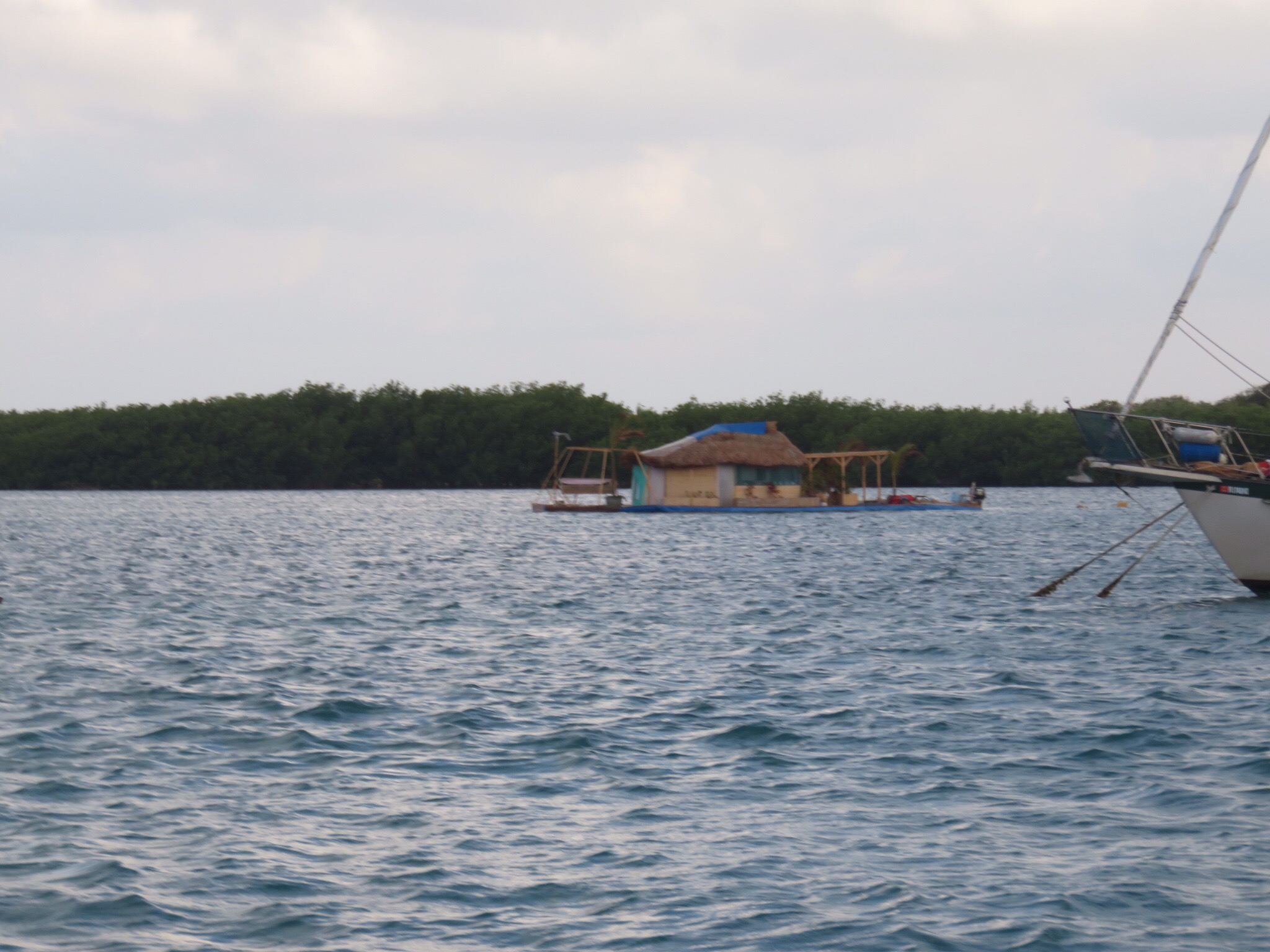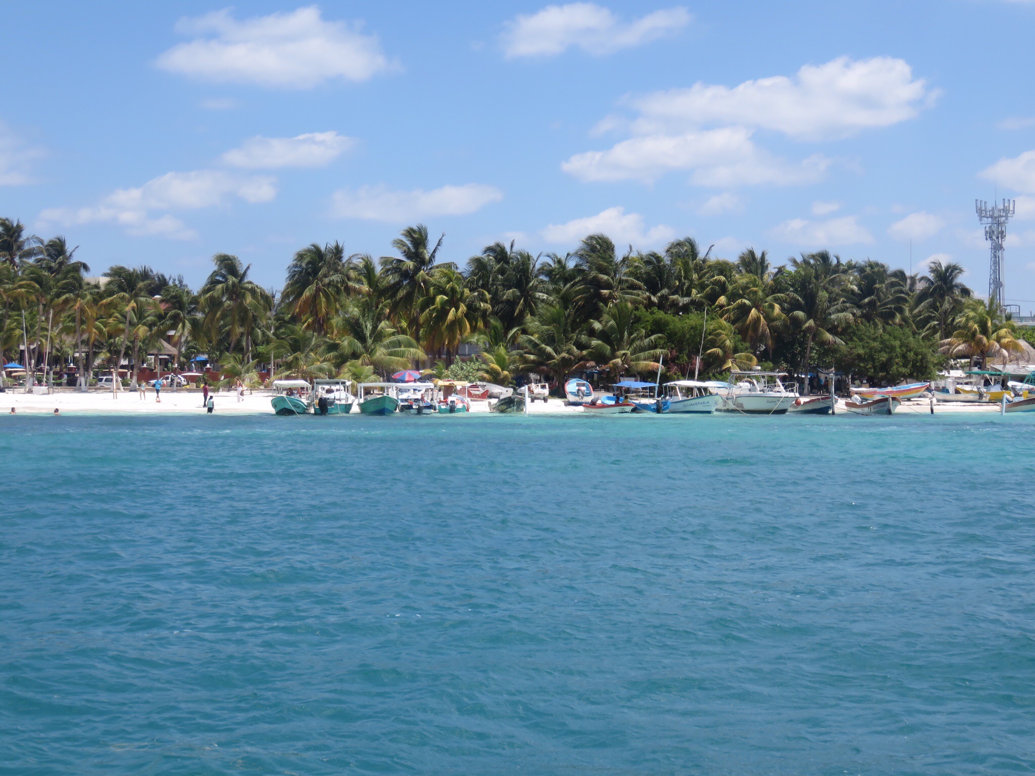 It is hard for me to capture the feeling I had when the island came into view. Leaving Florida and arriving in another country under sail 4 days later was something special. Not only that but the island that greeted us had pristine white beach, colorful boats, people radiating joy on the boats and beaches, and palm trees with coconuts. We had sailed into a tropical paradise and instantly all the hard work done to get ready was well worth it. With our yellow quarantine and Mexico flags raised and flapping in the wind we motored to an anchorage just on the other side of the channel across from some marinas. After some celebratory cocktails and spending some time tidying up the boat, Max and I grabbed the notebook with all our documents and hopped in the dinghy. Max rowed us over to El Milagro Marina where we were hoping to get a slip and checked in with customs. Arriving at the dinghy dock I found myself in awe of how incredibly relaxing the entire place looked. Mosaic table and chairs were built into the sand so one could sit partly submerged in the water while enjoying lunch or a drink. On shore numerous hammocks and lawn chairs were filled with people of all ethnicities lounging in the warm sun. Iguanas basked in the sun and thatched roofs covered the office and bar area. The moment our feet hit the dock for the first time in 4 days we both felt like we were moving. It was such an odd sensation, I felt like the dock was swaying back and forth- and it only intensified as we walked towards the dockmaster. We were greeted by a few different marina employees who kindly welcomed us before informing us that because it was after 1pm they would not be able to check us into the country today. Feeling a bit disappointed since we were all really looking forward to dinner out on the town, we explored the marina grounds for a few minutes and walked to a small store at the edge of the marina where we bought some cold beer to bring back to Mark and Kyle. Once back at the boat we informed Mark and Kyle of the news that we would be stuck on the boat until tomorrow and decided to make the best of it by going snorkeling.