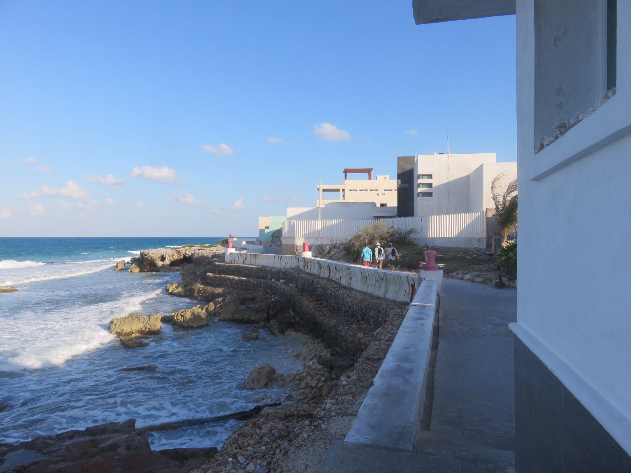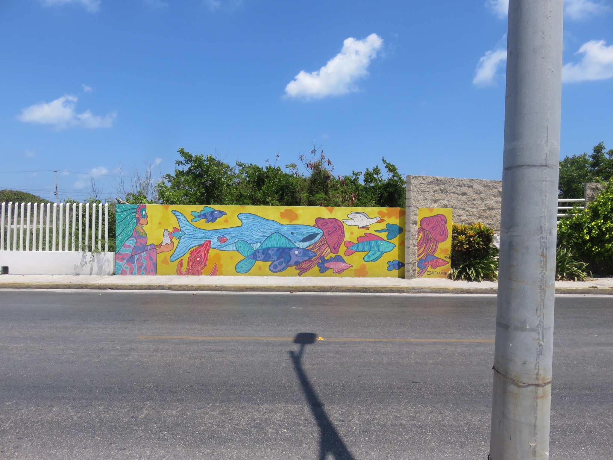 At the end of the process the immigration officer stamped our passports, provided us a visa, and welcomed us into the country. We all felt so thankful to be free to explore the country and not be confined to the boat. Within 20 minutes we had put on walking shoes and sunscreen, grabbed our backpacks and headed for the Island. Six hours and 8 miles later we had walked almost the entire Island! Leaving the marina we were instantly greeted by endless golf carts and mopeds; that is how everyone gets around on this island- even the police. The mopeds amazed me because many of them had over 3 people on them and then a baby or two hanging off the side in someone’s arms or standing at the driver’s feet- same as the golf carts. I will say though that everyone, except maybe the baby’s and small children, wore helmets on the mopeds. Interesting! Walking the Main Street for a while we quietly observed our surroundings- the colorful buildings and homes stacked really close together, the equally colorful skiffs lining the inland beaches, and some pretty awesome street art and murals. Finding a small opening between buildings we crossed over to the Gulf side of the island and walked North along the sea wall with large waves crashing down below. The waves were a mixture of clear blues and greens that would roll and smash down on the rock and white sand on the shoreline. Making our way back inland a bit we found the market area which were streets lined in colorful shops with jewelry, blankets, and endless trinkets lining the front of the small shops. Sitting down for some lunch I enjoyed the people watching and observing the cultural differences from America and this small tropical island. We found a convenience store and bought a SIM card for the Global cell phone we had bought before leaving and the nice men behind the counter helped me get it all set up- it took a few minutes due to the language barrier, but within 10 minutes Kyle and I were able to call our parents to check in and say hello. I was very thankful to be able to check in and catch up with my family! The rest of the afternoon was spent in a similar manner- exploring and enjoying the Isle of Mujeres. Around 6pm we arrived back at the marina where we took a quick swim to stretch our tired legs and sore bodies, before taking showers and using some wifi at the marina bar.