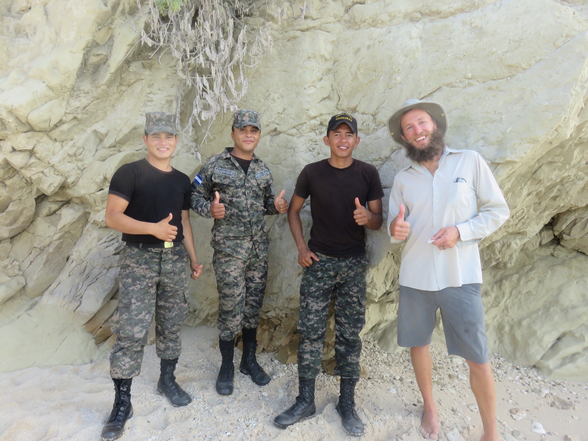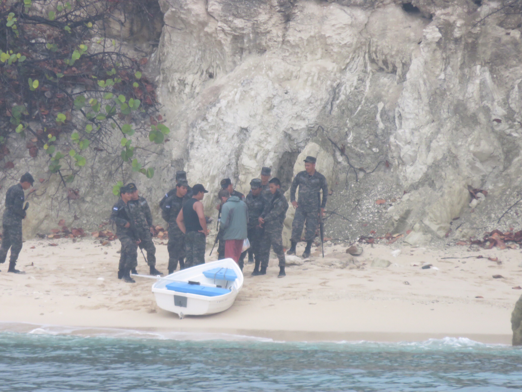Around 4pm I heard hollering and whistling again from the shoreline. “Max, I think they want you to go back over there and talk to them..” Hesitantly he got in the dinghy and rowed over. Again, we stood in the cockpit anxiously waiting to hear what they had to say. This time Max rowed back smiling. “Well he says, if we give them some cooking oil, they will take us on a tour of the island!” Laughing we quickly poured a half bottle of olive oil and grabbed a few garlic gloves to go with it. Getting dressed and carefully loading all 4 of us into the tiny dinghy Max rowed us back to the beach where 6 men were standing, this time only 1 had a gun- a lot less intimidating! As we speak very little Spanish between the 4 of us and none of them spoke any English, it was a bit funny doing introductions and trying to communicate. They were all very nice and thankful for the olive oil. Guiding the way we followed the men up the small cliff to the wooded area above the beach. We walked together for a while, attempting to ask questions- using our Spanish English dictionary as much as possible. All the men were under the age of 40, most seemed to be in their 20’s. A few minutes later we arrived at their living quarters. I asked if I could take some photos, but they said not until we got back to the beach, so I was unable to capture their living quarters which were positioned around a small soccer field. “Danielle”, Kyle pointed to me, “muy bien en futbol” he said in broken Spanish. This made the men smile and one ran around the corner, coming back with a soccer ball in his hand. Kicking off our shoes, Max said “Gringos against Honduras Navy?” They laughed and within minutes we were playing a rather heated game of soccer. Mark the goalie, Max Kyle, and I barefoot and dressed like salty sailors played the field against the navy men dressed in full uniform and combat boots. It was an absolutely wonderful game of soccer- the language barrier fell away as we all giggled and played the game. Kyle, Max, and I found ourselves exhausted after running for just a few minutes- steering a sailboat sure doesn’t keep us in shape! Soon after the Navy scored a goal I tied up the game by scoring one myself, before collapsing in the shade, out of breath and smiling. The men laughed at how tired we were- “smokers??” They kept asking. No! Haha just out of shape from living in a 40ft space for the last few weeks. The guy who seemed to be in charge of the group that was leading us around brought out bagged water for each of us, and we sat in the shade with the men, talking as much as possible. Their living quarters looked new- wooden buildings with opened windows and doors. A radio tower stood on the other side of the soccer field, with a small building that seemed to be where the cooking took place. Walking us over to a trail in the woods one of the men began climbing a tree and brought down small green fruits, telling us to bite into them. A bit sour, but rather good we enjoyed the fruits of which I can’t remember the name anymore. We slowly made our way back to the beach where the dinghy was, stopping at the only dock on the island on the way. A large, exposed cement dock, where the men get dropped off. Through broken Spanish and some gestures here is what I gathered: About 20 men live on the island for 45 days at a time. Then a big boat comes and picks them up, dropping off a different crew of men. It takes them 2 days by boat to get to the mainland, where they spend a couple months before doing another 45 day stretch on the island. There is no electricity and sometimes they run out of food, in which case they eat the fruit and hunt the large iguanas that are all over the island. They do not have a boat, and have no way to communicate with the outside world except for a radio. The man I spoke with was 30 years old, had 3 kids and had been in the Navy for 6 years. He seemed happy and enjoyed the time on the island.