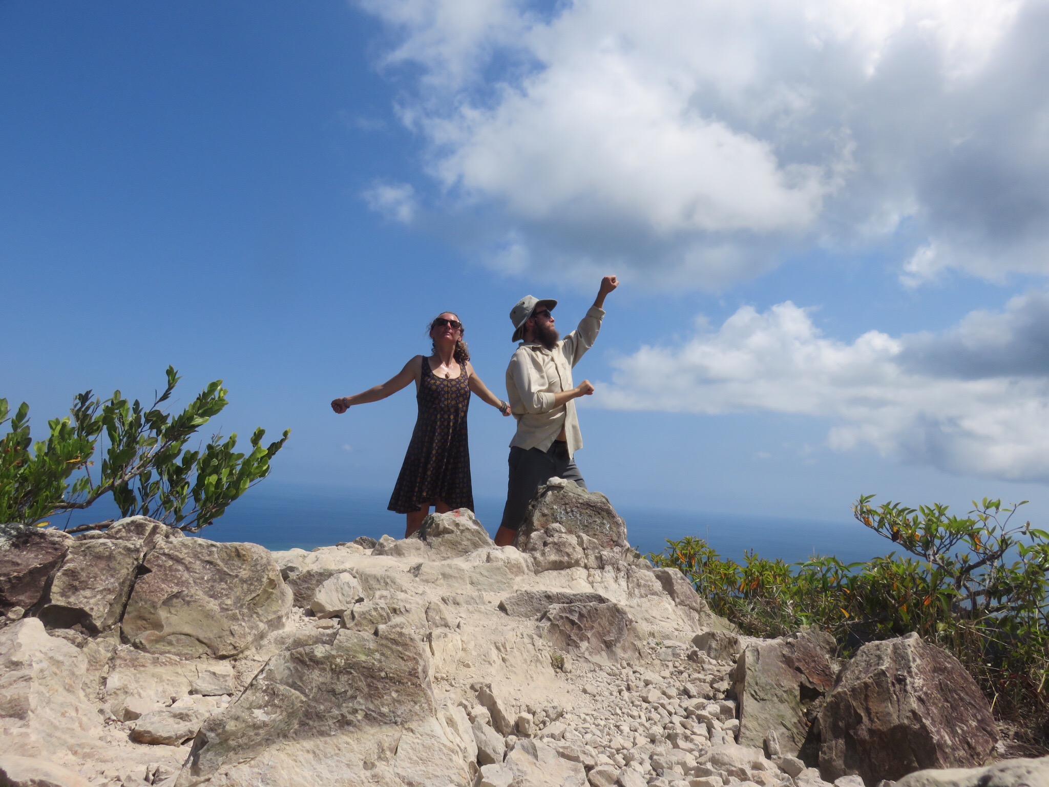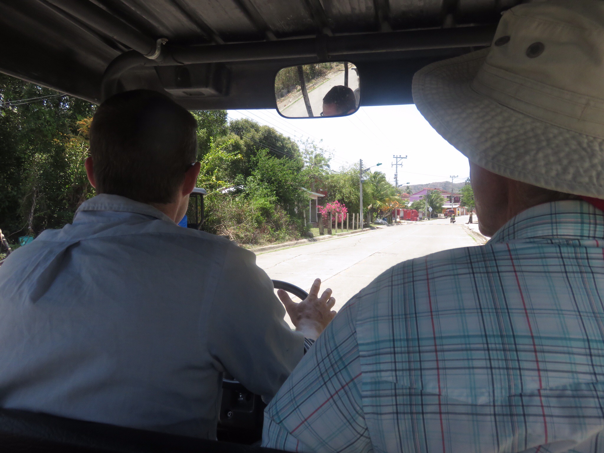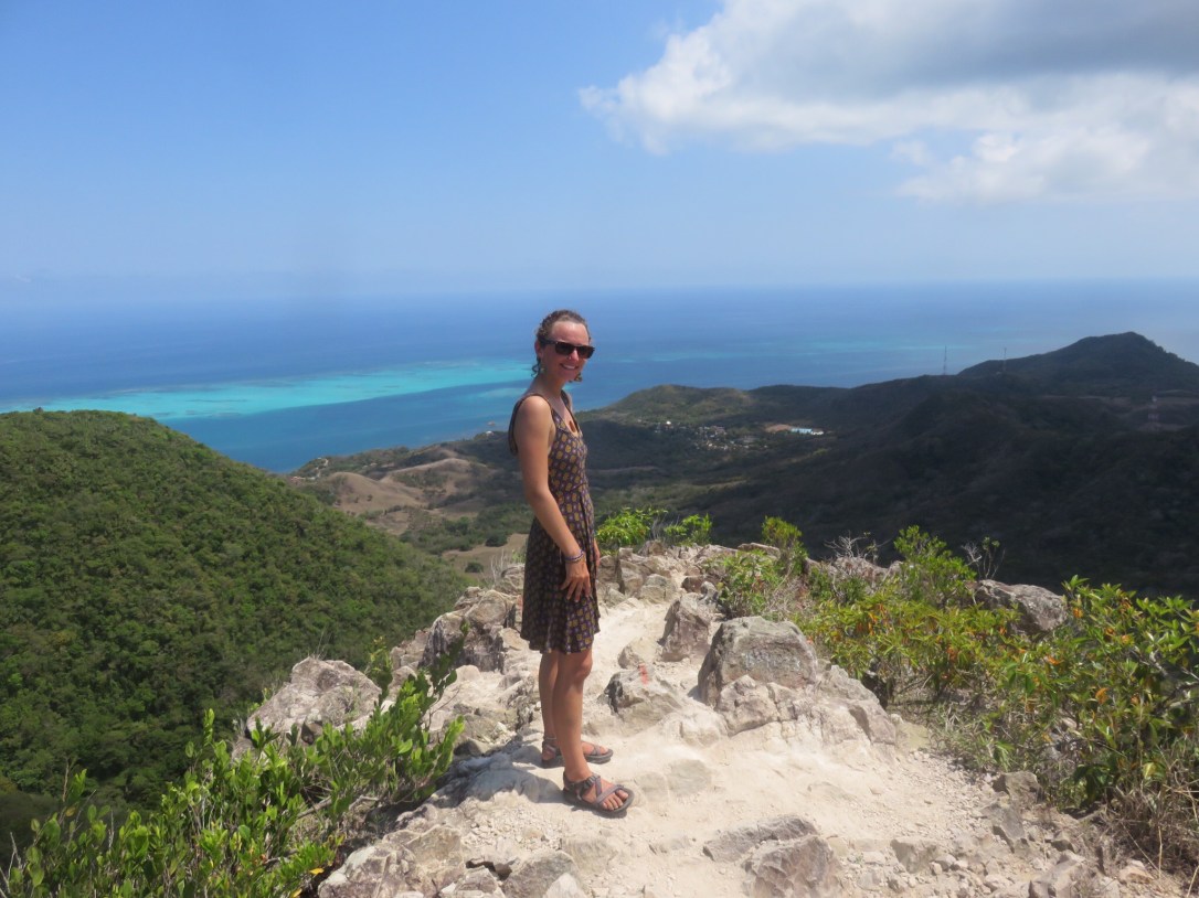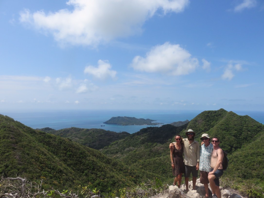 The following day we headed into town in search for a phone, internet, and information on a hotel. It took quite some time to accomplish these things, but with a hotel booked, a phone to call my parents, and some time exploring the Main Street we decided to rent a 4 x 4 golf cart for the afternoon. With Max driving we drove around the entire island, stopping by mine and Kyle’s hotel to check in and get our room key. The golf cart tour turned out to be a great time and we found a hiking trail up a dirt road that led us to the most spectacular views. As we weren’t anticipating a hike like the one we took, I was wearing a dress, the wrong shoes, and didn’t bring water. The climb was extremely steep- ropes lined the trail in order to aid in climbing up. But the moment we arrived at the top the difficulties of climbing up the mountain faded away. A 360 degree view of the entire island and all surrounding islands took my breath away. In fact we could even see the anchorage and make out the spec that was High Climber. Mark and Max took a different trail down while Kyle and I headed back to the golf cart to pick them up at a different trail head. The thought of water caused us to hike really fast and the way down was much quicker and easier than the way up.