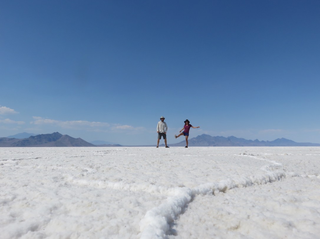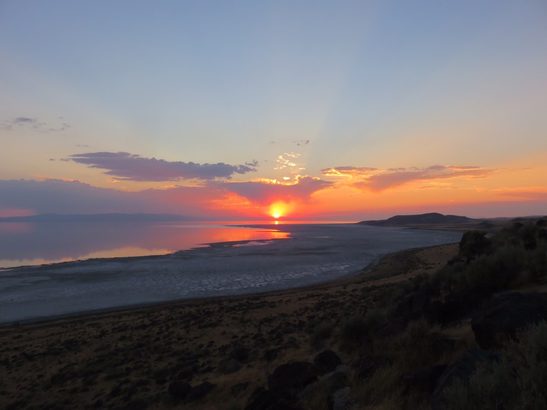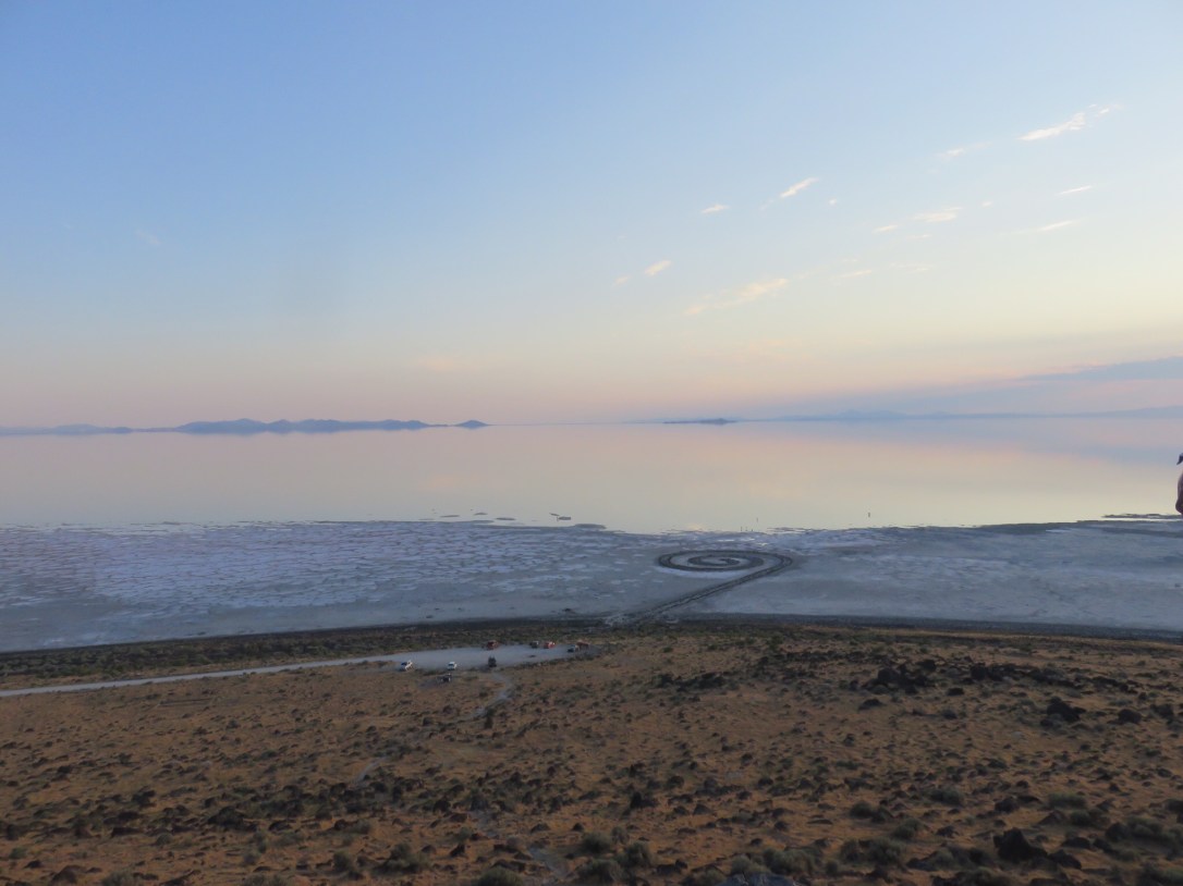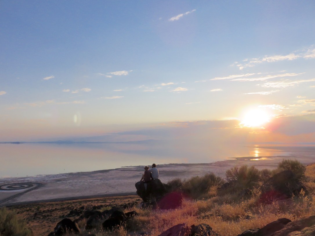 After leaving Rockport Kyle and I said our goodbyes to my friends and to Salt Lake City and headed towards the Great Salt Lake. We found a free campsite at the Spiral Jetty- a work of earth art made in the 70’s by an artist using large rocks to create a giant spiral on the shore of the Great Salt Lake. The camping was beautiful and we enjoyed a gorgeous sunset. Yesterday morning when we awoke at the Spiral Jetty we enjoyed some hot coffee with honey (thanks Marianne for the backyard honey!) and then put on our swim suits and headed towards the lake. As the name implies the Great Salt Lake is extremely salty. I had swam in it once before when I was younger, but really wanted Kyle to experience it. After hiking out almost a half mile to get to knee deep water we plunged into the pink salty water. And just as I remember we floated! It is such a strange sensation, because of how salty the water is you float completely on the surface- not sinking at all. It’s pretty magnificent. Plus we were the only ones for miles and the water is pink due to the salt. I had remember that it is important to bring enough fresh water to shower with afterwards so when we were done swimming we rinsed off in a 2 gallon water jug that we set on the roof of Sunny.