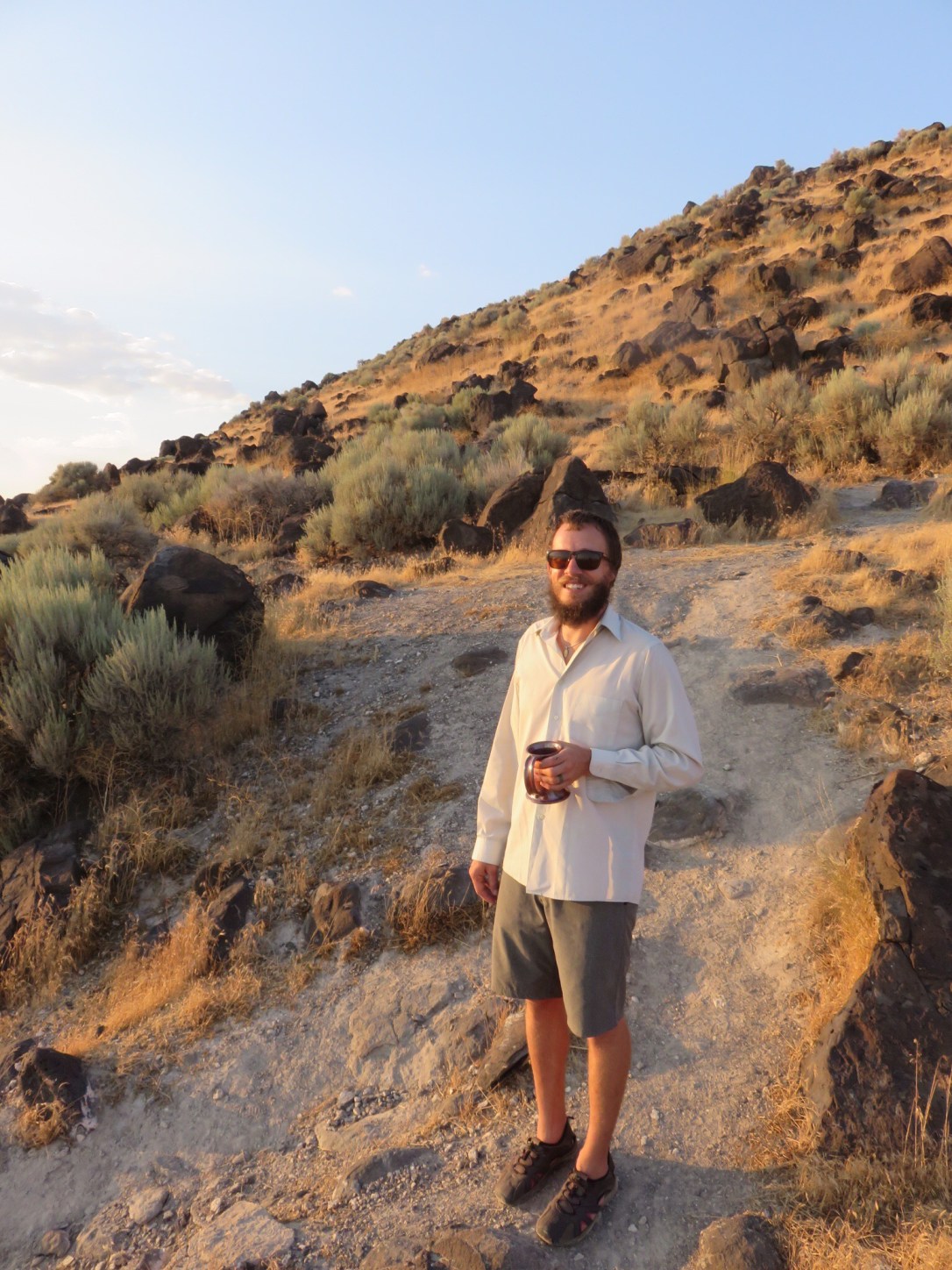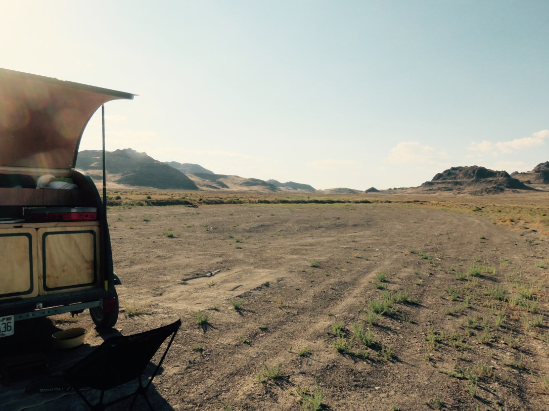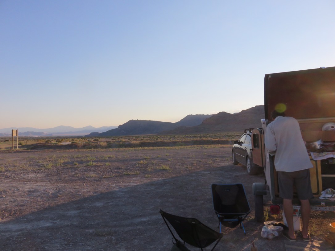 After leaving Rockport Kyle and I said our goodbyes to my friends and to Salt Lake City and headed towards the Great Salt Lake. We found a free campsite at the Spiral Jetty- a work of earth art made in the 70’s by an artist using large rocks to create a giant spiral on the shore of the Great Salt Lake. The camping was beautiful and we enjoyed a gorgeous sunset. Yesterday morning when we awoke at the Spiral Jetty we enjoyed some hot coffee with honey (thanks Marianne for the backyard honey!) and then put on our swim suits and headed towards the lake. As the name implies the Great Salt Lake is extremely salty. I had swam in it once before when I was younger, but really wanted Kyle to experience it. After hiking out almost a half mile to get to knee deep water we plunged into the pink salty water. And just as I remember we floated! It is such a strange sensation, because of how salty the water is you float completely on the surface- not sinking at all. It’s pretty magnificent. Plus we were the only ones for miles and the water is pink due to the salt. I had remember that it is important to bring enough fresh water to shower with afterwards so when we were done swimming we rinsed off in a 2 gallon water jug that we set on the roof of Sunny.