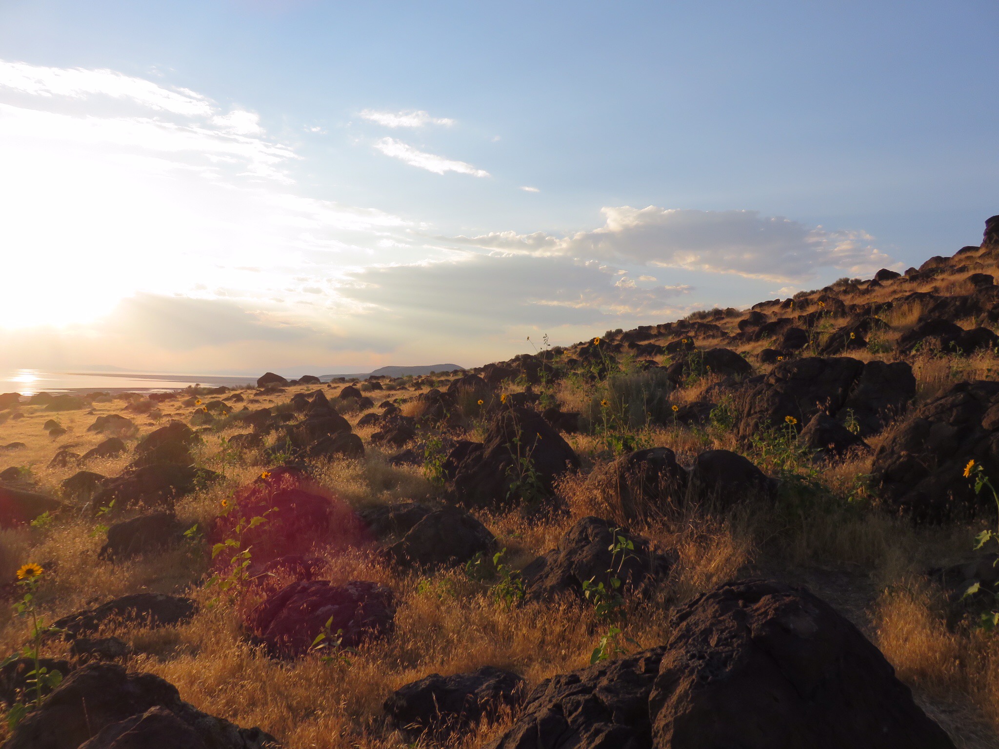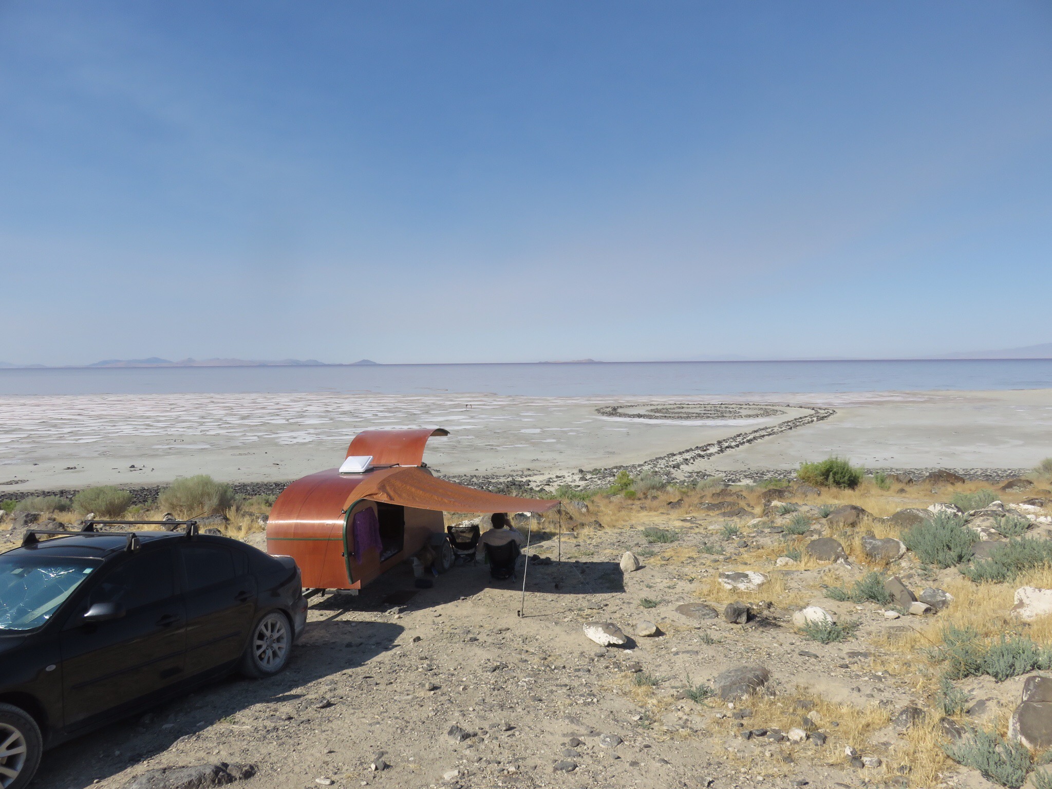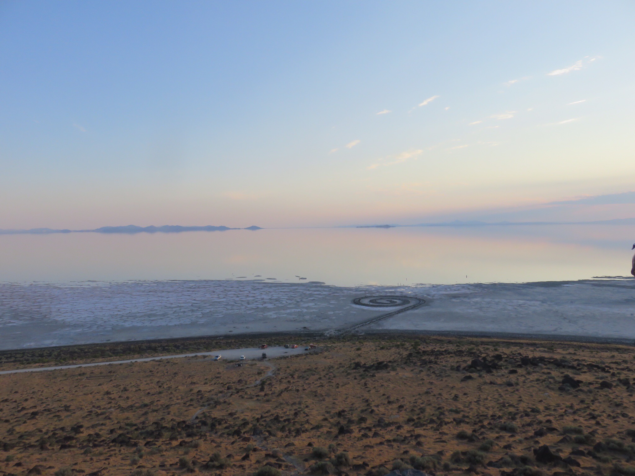 After leaving Rockport Kyle and I said our goodbyes to my friends and to Salt Lake City and headed towards the Great Salt Lake. We found a free campsite at the Spiral Jetty- a work of earth art made in the 70’s by an artist using large rocks to create a giant spiral on the shore of the Great Salt Lake. The camping was beautiful and we enjoyed a gorgeous sunset. Yesterday morning when we awoke at the Spiral Jetty we enjoyed some hot coffee with honey (thanks Marianne for the backyard honey!) and then put on our swim suits and headed towards the lake. As the name implies the Great Salt Lake is extremely salty. I had swam in it once before when I was younger, but really wanted Kyle to experience it. After hiking out almost a half mile to get to knee deep water we plunged into the pink salty water. And just as I remember we floated! It is such a strange sensation, because of how salty the water is you float completely on the surface- not sinking at all. It’s pretty magnificent. Plus we were the only ones for miles and the water is pink due to the salt. I had remember that it is important to bring enough fresh water to shower with afterwards so when we were done swimming we rinsed off in a 2 gallon water jug that we set on the roof of Sunny.