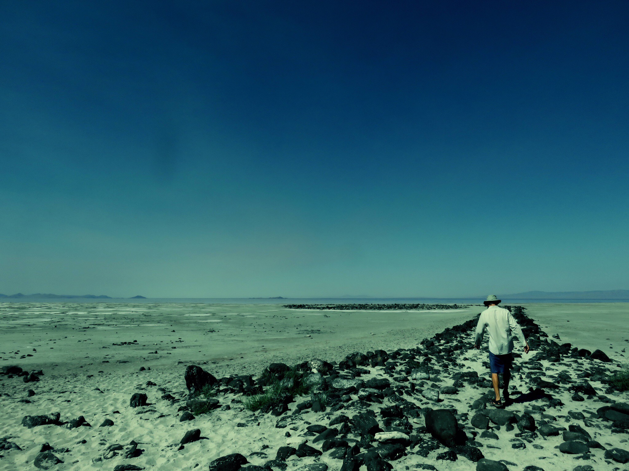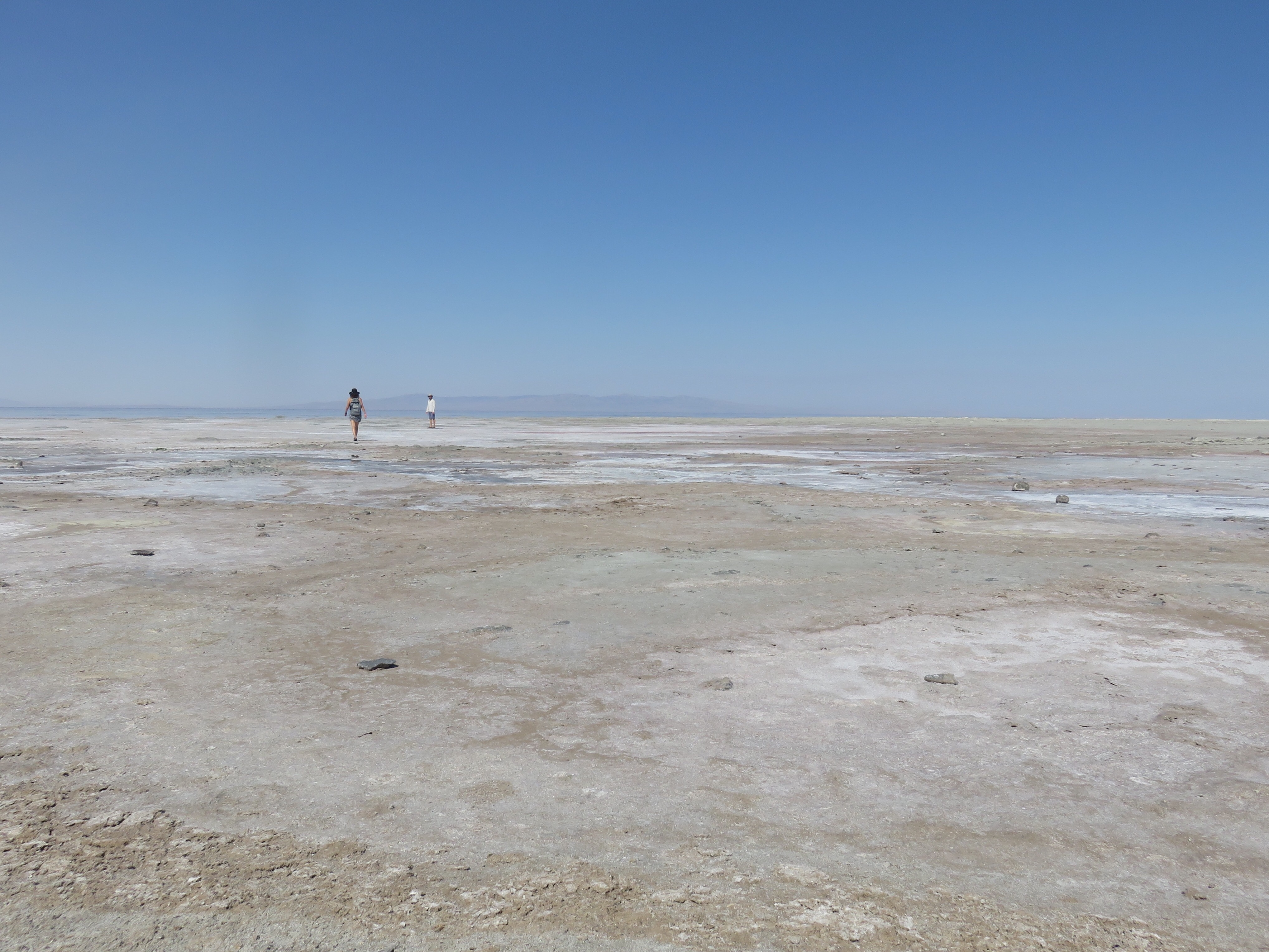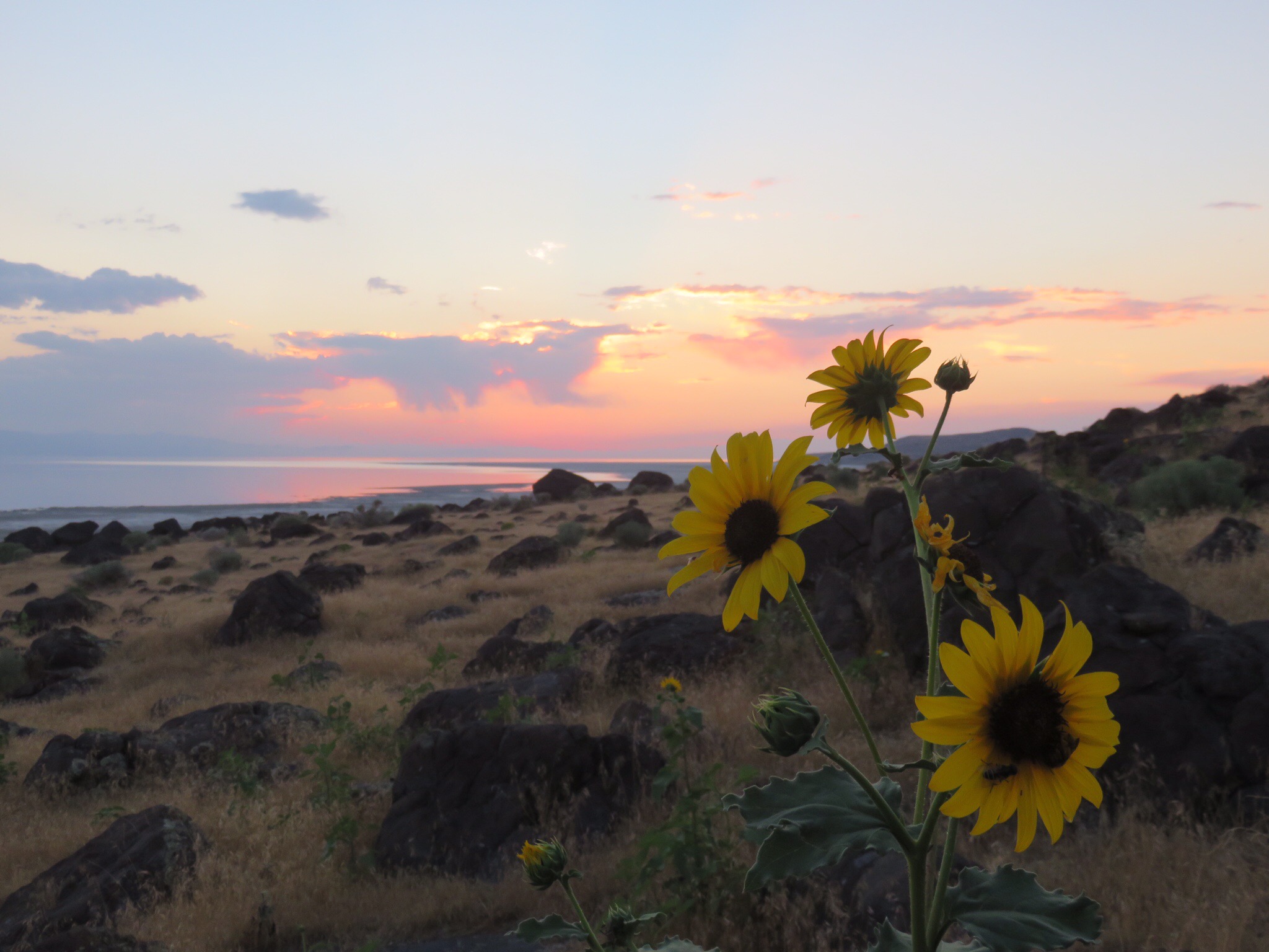 After leaving Rockport Kyle and I said our goodbyes to my friends and to Salt Lake City and headed towards the Great Salt Lake. We found a free campsite at the Spiral Jetty- a work of earth art made in the 70’s by an artist using large rocks to create a giant spiral on the shore of the Great Salt Lake. The camping was beautiful and we enjoyed a gorgeous sunset. Yesterday morning when we awoke at the Spiral Jetty we enjoyed some hot coffee with honey (thanks Marianne for the backyard honey!) and then put on our swim suits and headed towards the lake. As the name implies the Great Salt Lake is extremely salty. I had swam in it once before when I was younger, but really wanted Kyle to experience it. After hiking out almost a half mile to get to knee deep water we plunged into the pink salty water. And just as I remember we floated! It is such a strange sensation, because of how salty the water is you float completely on the surface- not sinking at all. It’s pretty magnificent. Plus we were the only ones for miles and the water is pink due to the salt. I had remember that it is important to bring enough fresh water to shower with afterwards so when we were done swimming we rinsed off in a 2 gallon water jug that we set on the roof of Sunny.