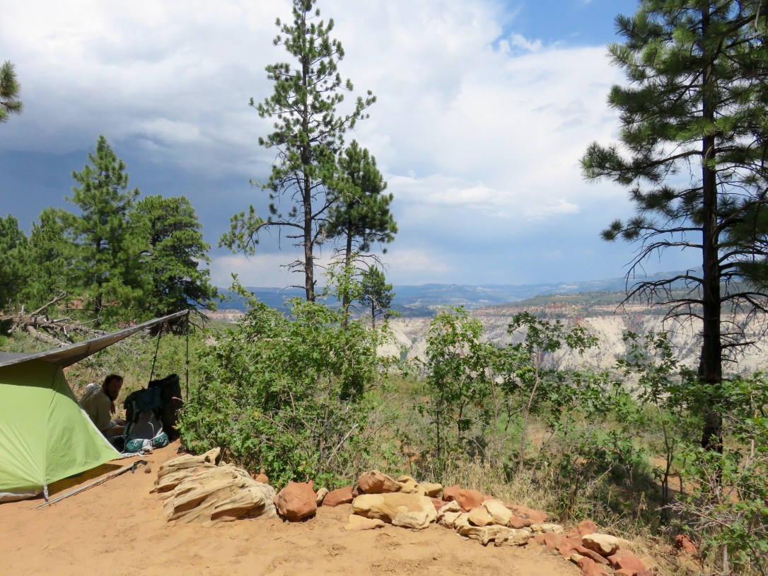4pm- The thunder head we had been watching all afternoon started moving in, bringing booming thunder and dark skies. Thankfully the clouds lessened the affect of the sun, allowing us to come out from under our sun shade we had assembled with our ground tarp and trekking poles. It was pretty magnificent- there we were, just the two of us in a secluded campsite, our tent, food, and water with a spectacular view and a thunder storm rolling in.