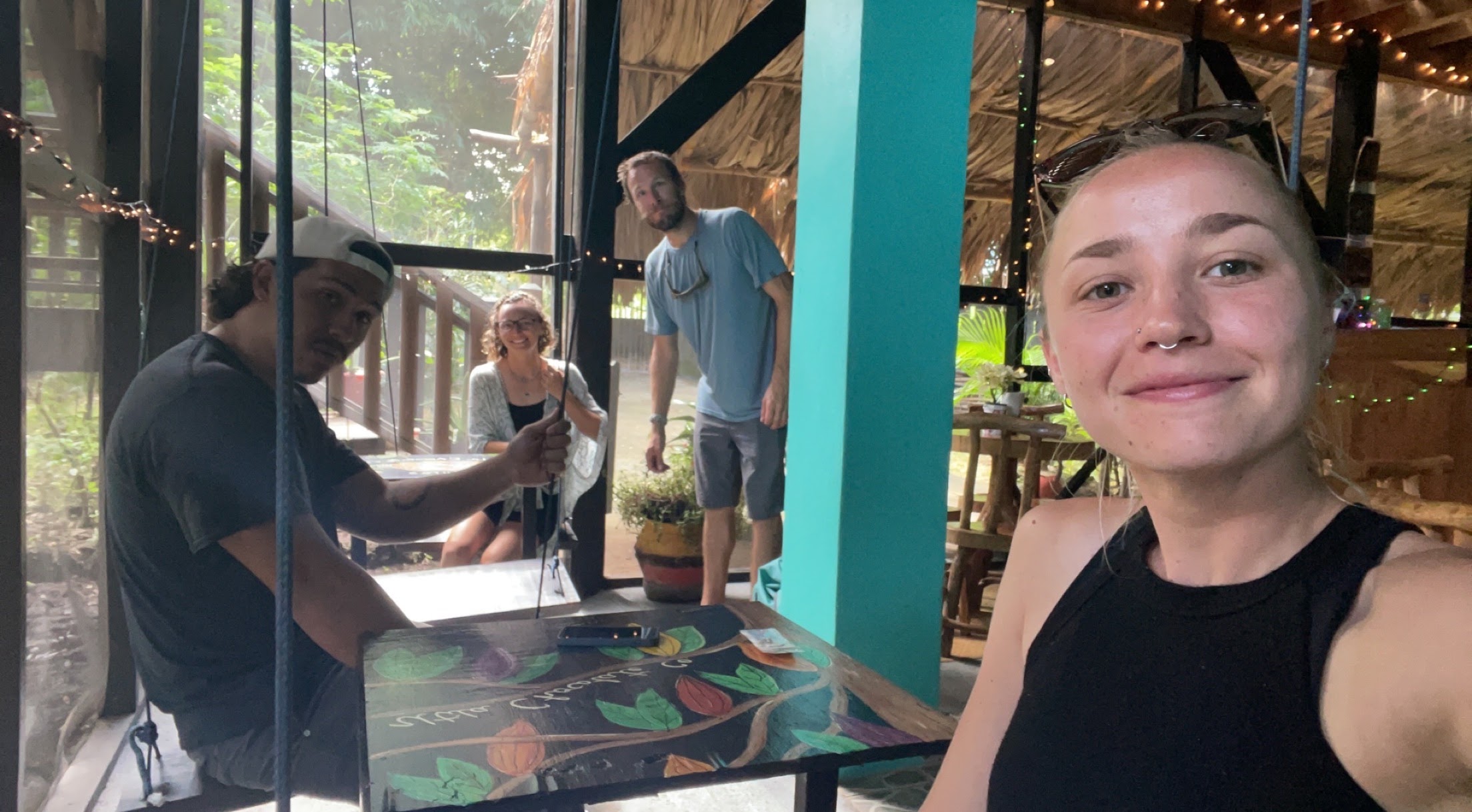 -Golf cart exploring: The day after Mango Tango we rented a golf cart for 24 hours and explored as much of the island as we could. We drove around pretty aimlessly and found some incredible locations. We found some freshwater caves, a shore line lined in the most interesting rock formations, a hiking trail that led to an observation tower that gave us 360 views of the entire island and beyond. We drove through narrow streets of neighborhoods and waved at the locals sitting outside of their houses. We found ourselves on some steep, muddy roads, and giggled and held our breath, hoping the golf cart would make it up to the top and not start sliding backwards down the hill. We saw the island’s dump and trash pile that was almost as tall as the highest point of the island. We found iguanas in the underbrush and took pictures of the mini dinosaurs. And then, most importantly, we found ourselves at the Utila Chocolate Company. This was an experience similar to Mango Tango. We walked into this place, completely covered in dense trees, giving it the feeling that it was in the middle of the jungle. The vibe was calm, quaint, and the air smelled incredible. The smell of fresh chocolate, coffee, and homemade ice cream filled our nostrils. Swings hung from the ceiling and we all chose a swing after we ordered. I ordered a coffee/chocolate milkshake. Kyle ordered something called “Death By Chocolate” which I am sure you can imagine. Mason and Zoie ordered different types of homemade ice cream, other chocolate drinks, and some fruit juices. We had so much fun, swinging in the cafe of this chocolate company, surrounded by a screened in porch which was surrounded by dense trees and forest.