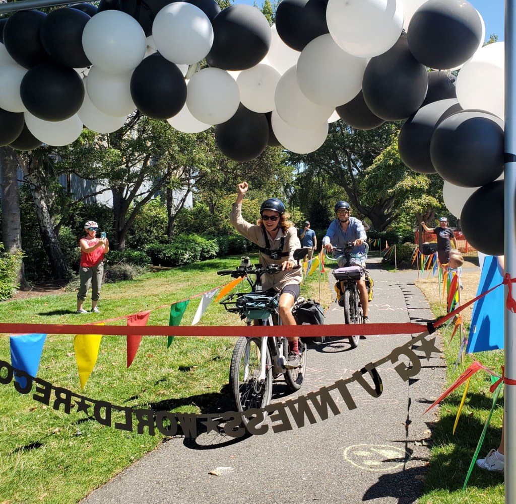 “When we crossed the finish line, I felt a sense of accomplishment that was completely unexpected. The people cheering, the cow bells ringing, the faces smiling and signs waving- it took me by surprise. I used to tell myself a story that I didn’t like crowds, that I was shy and didn’t want any attention on me. But in that moment, the moment I broke the ribbon with the front rack of my electric bicycle with Kyle following directly behind me, the moment we parked our bikes for the last time, the moment we turned and faced the small crowd that had gathered and smiled and clapped and cheered, I realized that was just a story. An old narrative I could leave behind. So instead of hiding behind that old narrative, I relished in the excitement. I allowed the attention to be on us for a few moments. I giggled and laughed and grabbed Kyle’s hand and we thanked the crowd and they all cheered one more time. It was a special moment. A moment I will take with me through my journey of life, a moment I will cherish and always be thankful for. It was in that moment that I realized: this journey wasn’t just about me and Kyle. This journey wasn’t just about our electric bicycles. This journey was bigger than I had ever realized, and am still realizing. It was about community, about friends, strangers, family, and people coming together to celebrate and find joy in the adventure of our electric bicycle tour of the US. Many people came together to congratulate us on breaking the world record for longest distance traveled by motorized bicycle, and for the first time in my life, I allowed them to. I didn’t try to hide. I didn’t try to shy away. Instead, I rejoiced in the shared joy and excitement, and the entire experience was magical.”